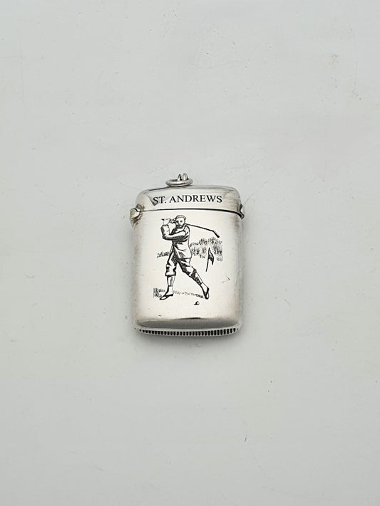 Collectable Antique Sterling Silver Vesta Case with St. Andrews Golfer Engraving - 1897