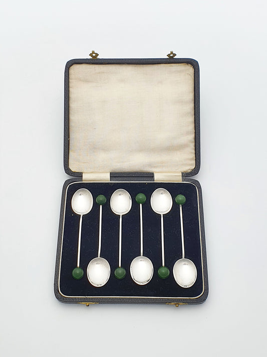 Set of Six Art Deco Solid Silver & Green Jade Coffee Spoons - 1934