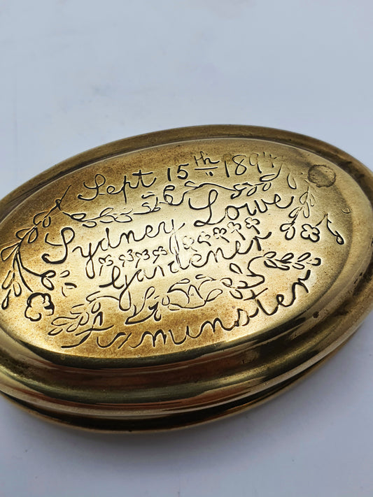 Lovely Engraved Victorian Brass Snuff Box – Dated 1894