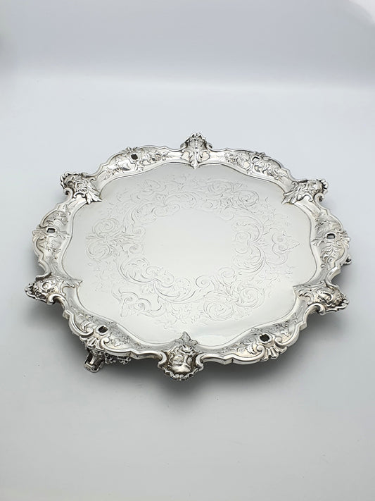 Unusual Antique Victorian Silver-Plated Salver with Figural Masks & Ornate Engraving – circa 1880