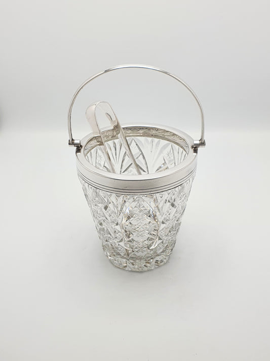 Nice Vintage Cut Glass Ice Bucket with Silver-Plated Rim, Tongs and Strainer – circa 1925