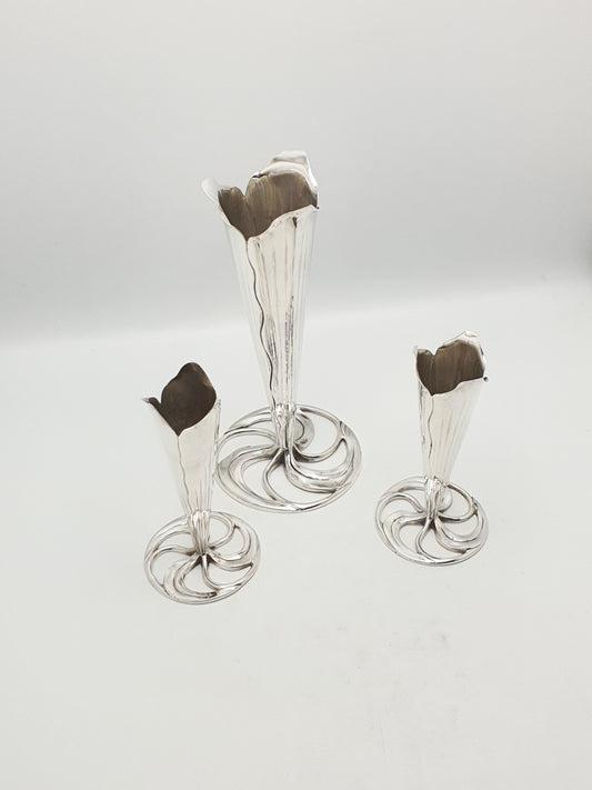 Elegant Set of 3 Silver Plated Arts and Crafts Trumpet Vases – circa 1890