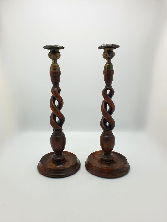 Pair of Antique Barley Twist Oak and Brass Candlesticks – circa 1920