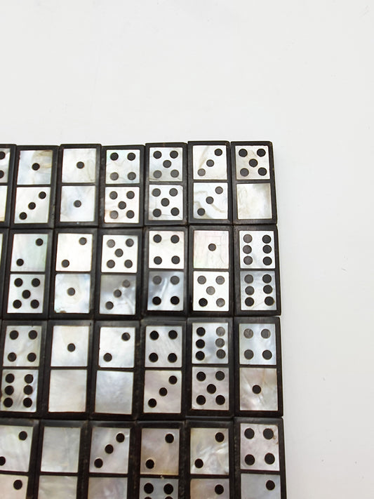 Fabulous Mother-of-Pearl & Black Domino Set with Drawstring Pouch – circa 1850