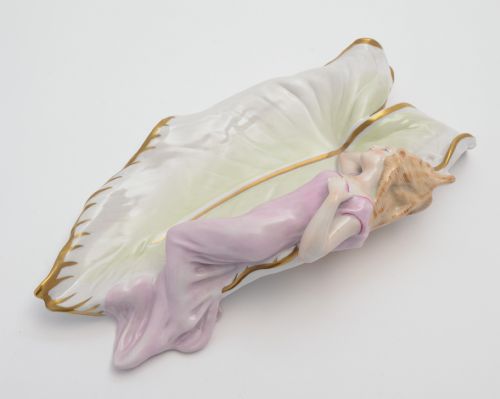 Delightful china trinket tray depicting lady reclining gracefully on a leaf. This piece is probably Continental maybe Austrian. There is a mark on the back with a crown and M. It is hand painted with gold edging on the leaf. A lovely piece would make a great gift. Length is approx. 9 1/2 x 5