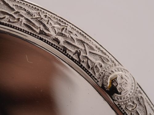 A nice English Art Deco silver plated 2 tier cake stand with embossed Celtic pattern to both removable plates. Stands on 4 splayed feet with curved carrying handle. Circa 1930. FREE worldwide delivery. Measurements: Height: 10 1/2 (approx 26.25cm) Length (base): 11 (approx 27.5cm) Diameter of plates: 7 3/4 (approx 19.5cm) Total weight: 1233g In good condition - any dark areas are shadows from the photography there is no damage to the silver plate.