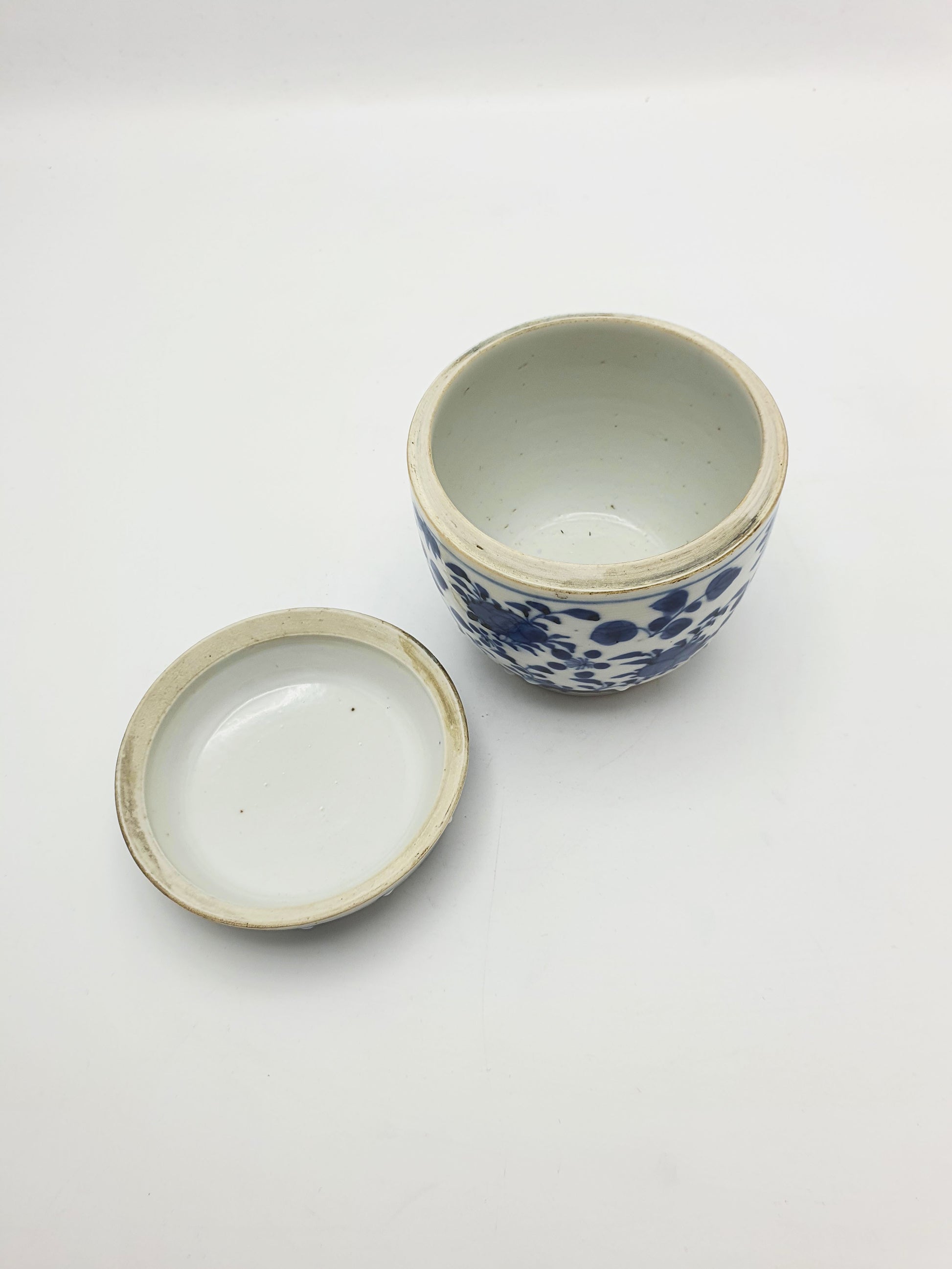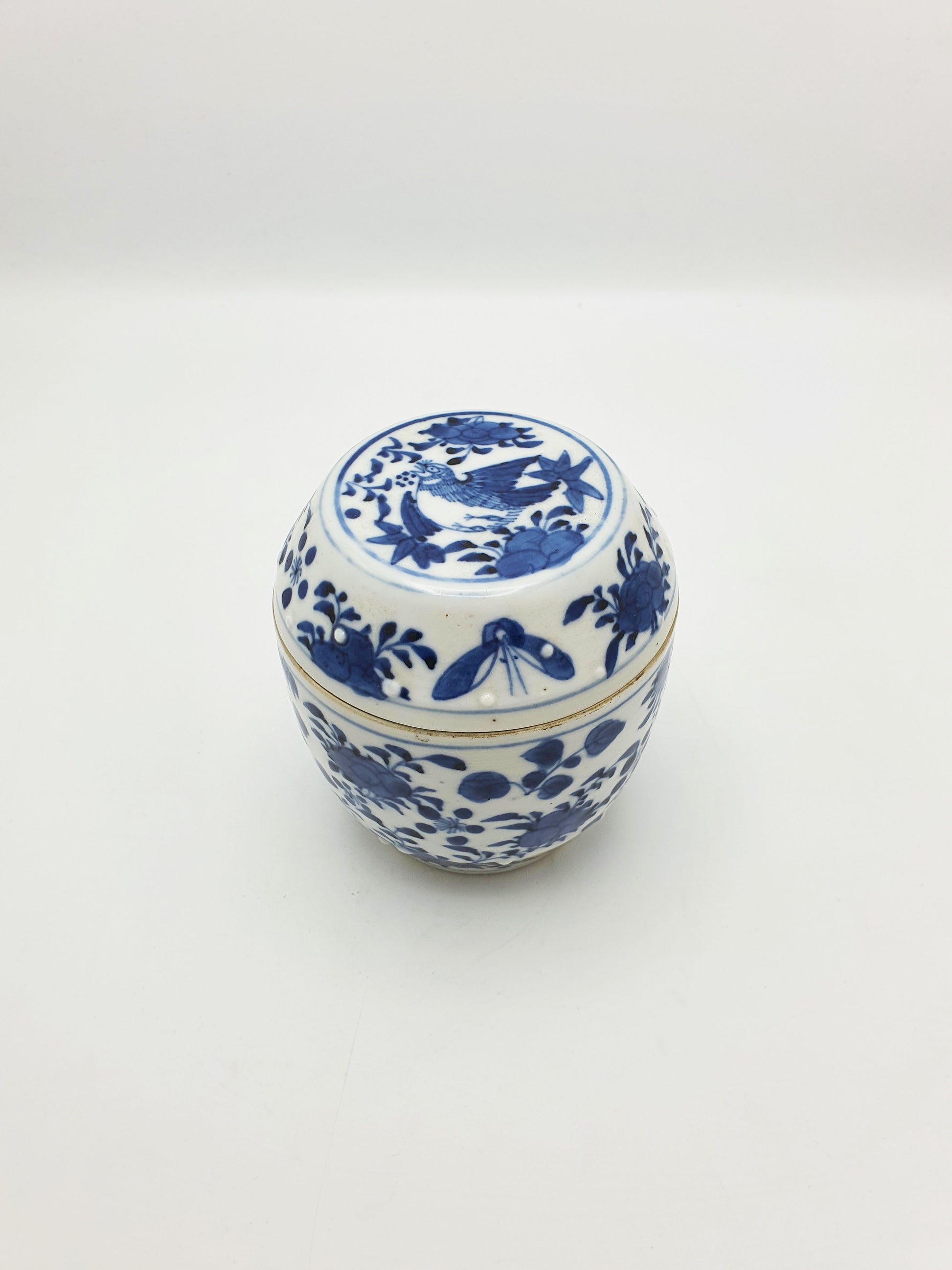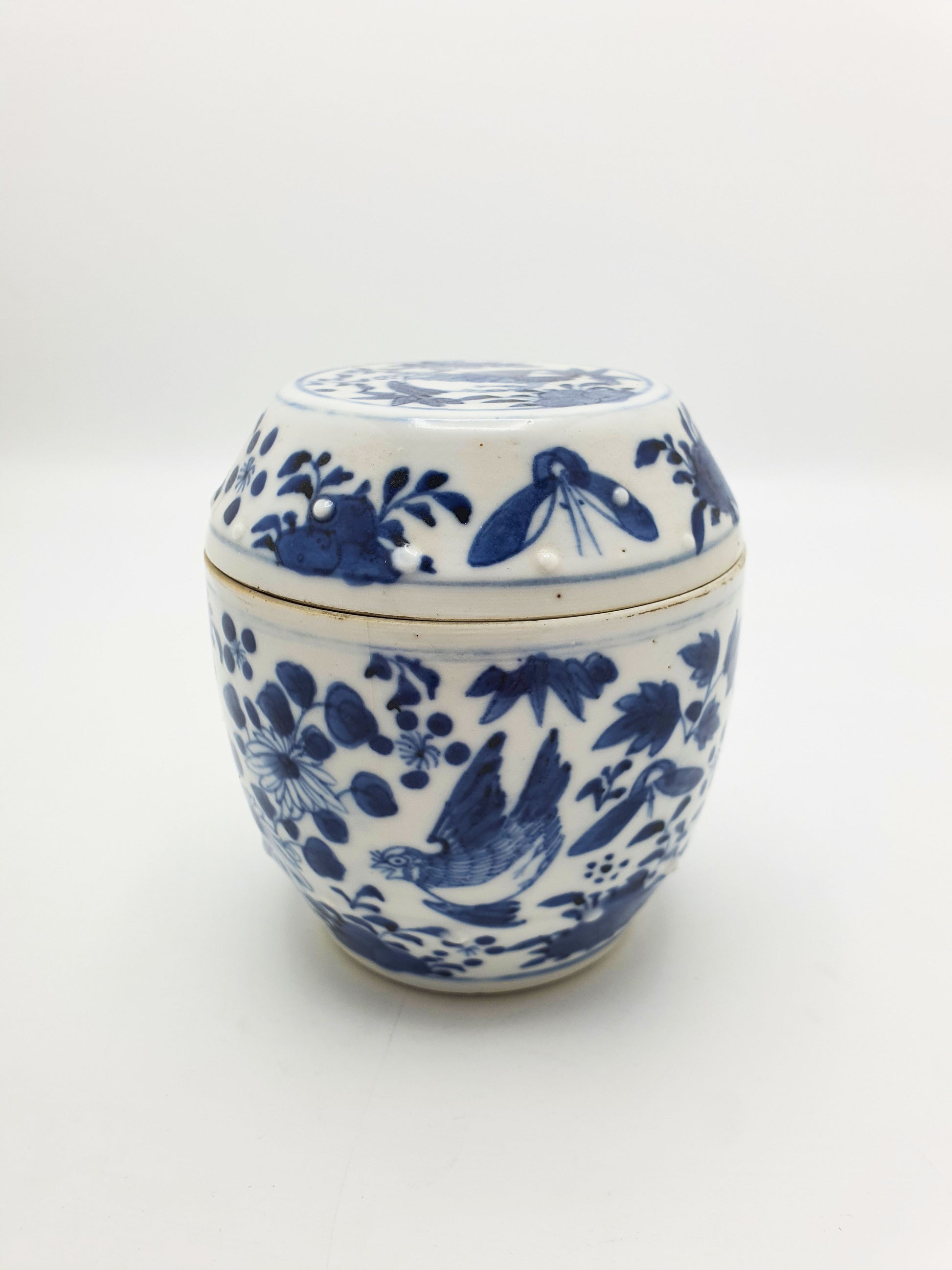Antique Chinese Blue and White Covered Jar with Bird & Floral Motif – circa 1860