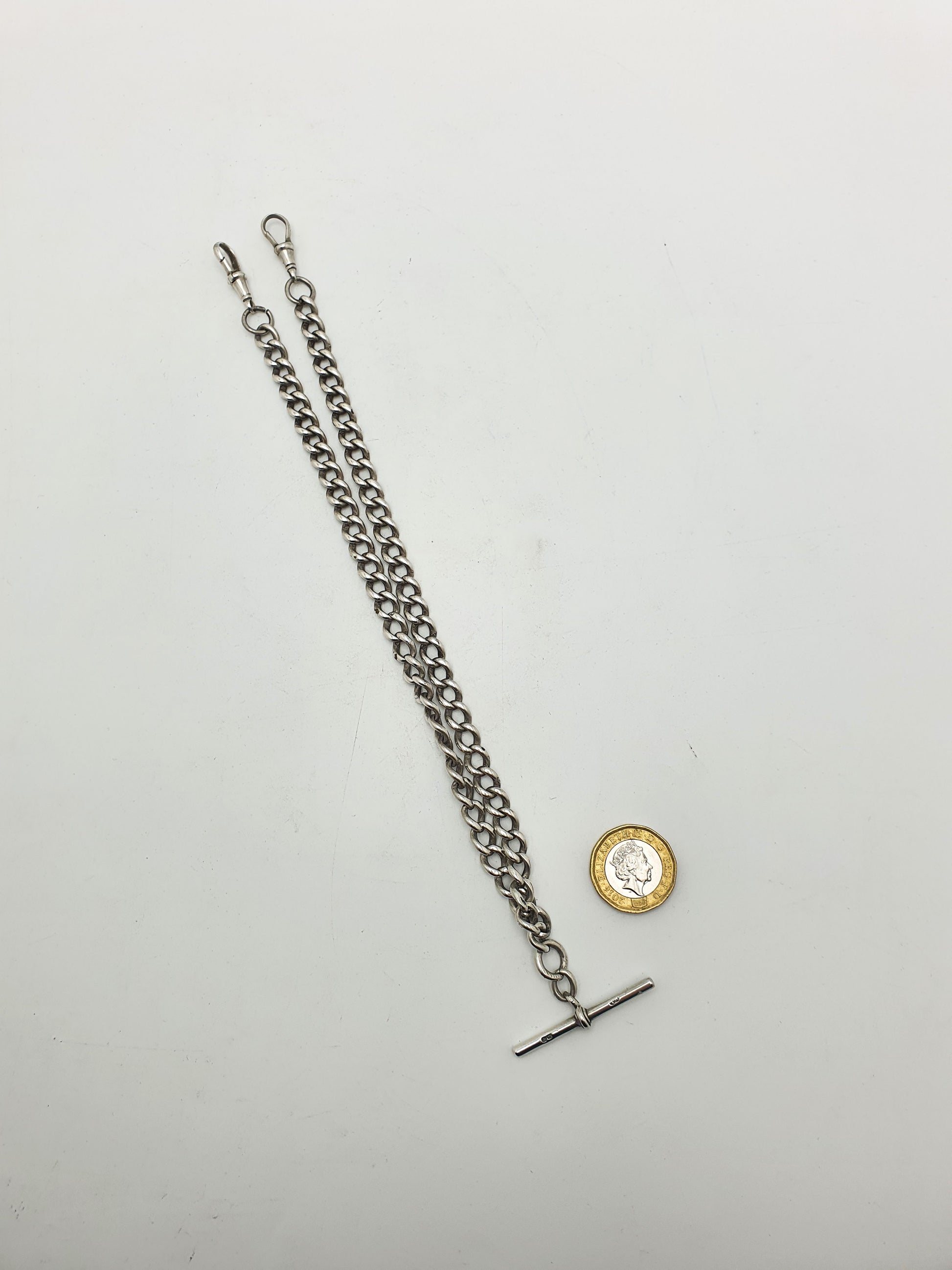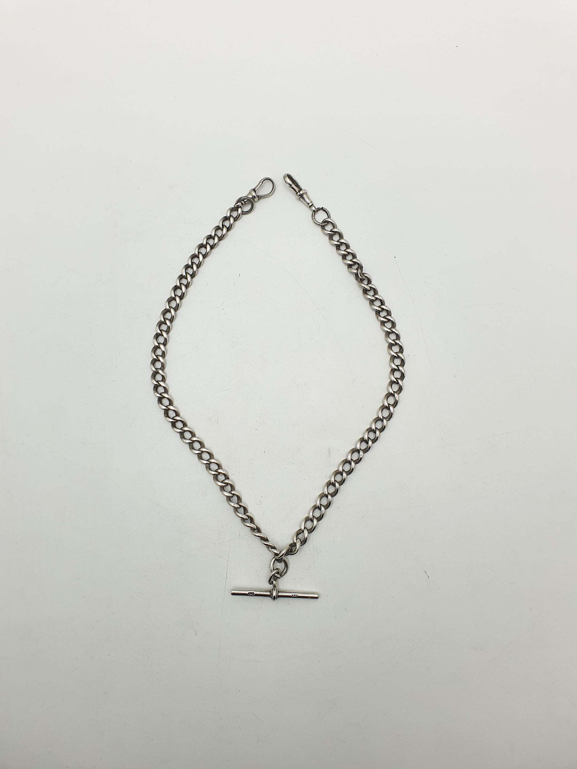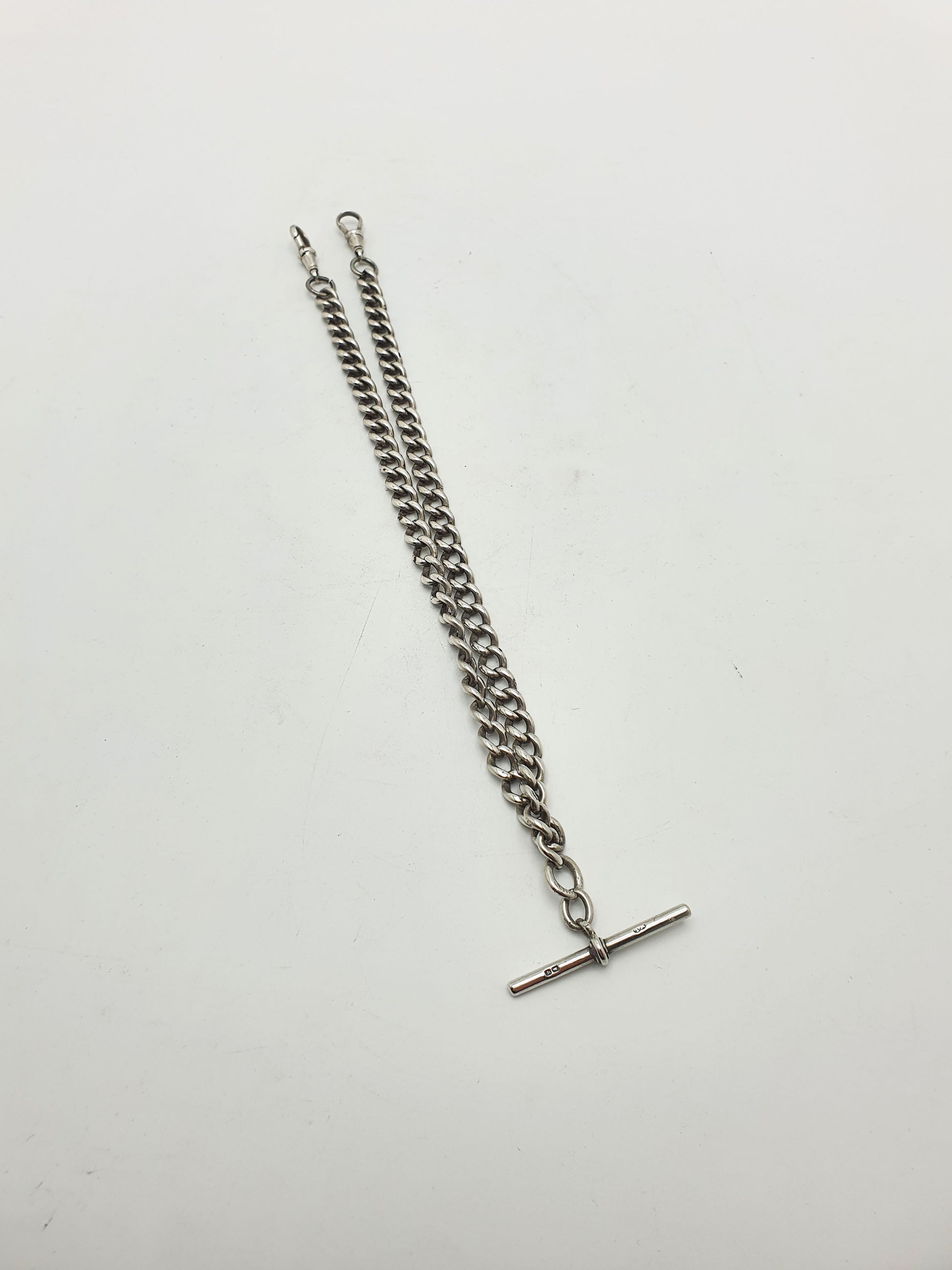 Antique Double Albert Sterling Silver Watch Chain featuring a traditional curb link design with a central T-bar and twin dog clips. Hallmarked for 1915.