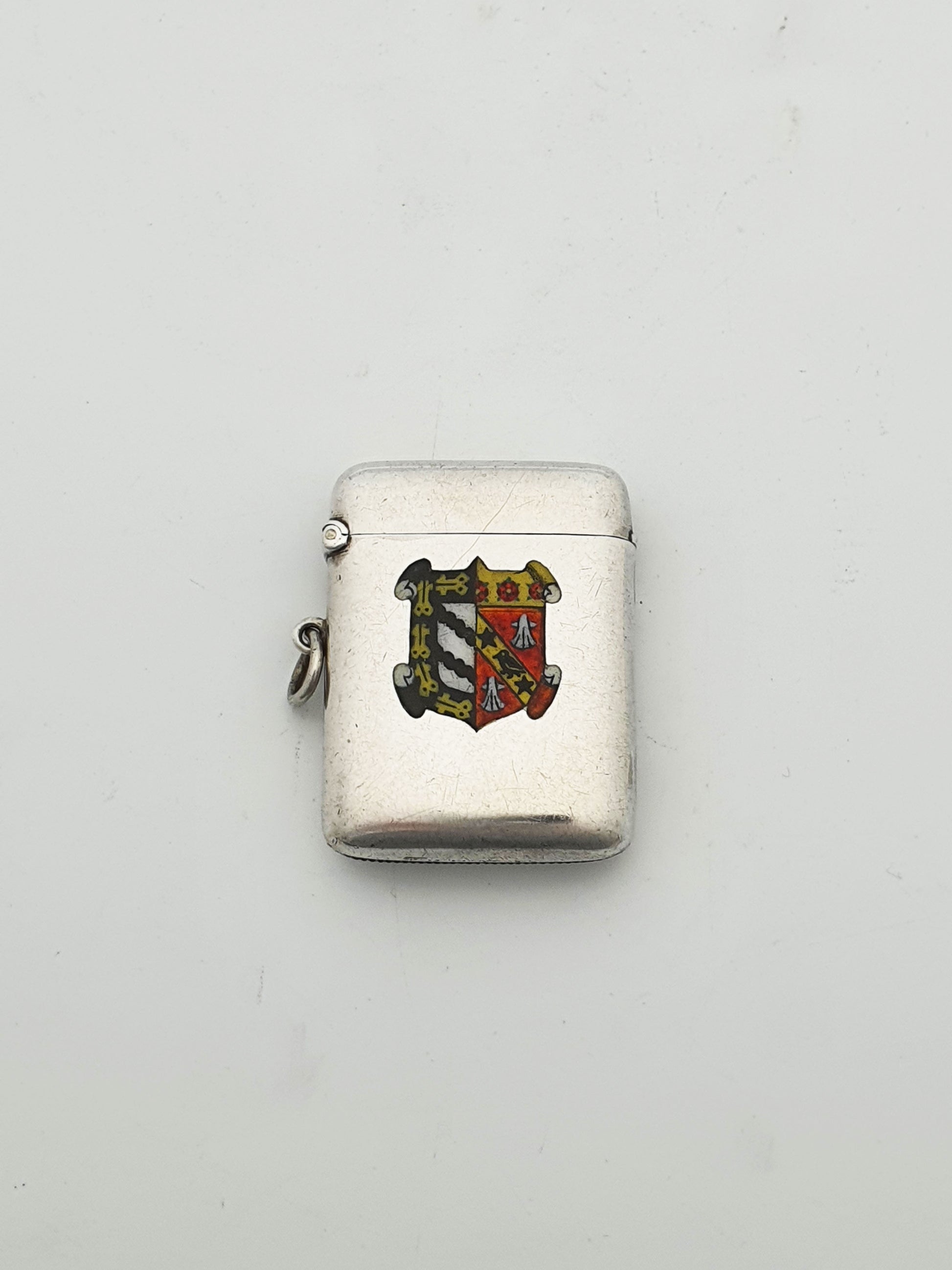 An Antique Edwardian Sterling Silver Vesta Case featuring a striking hand-painted enamel heraldic crest on the front. Comfortable to hold, with a softly curved form that fits snugly in hand or pocket. This silver vesta has an attached loop for suspending from a watch chain.