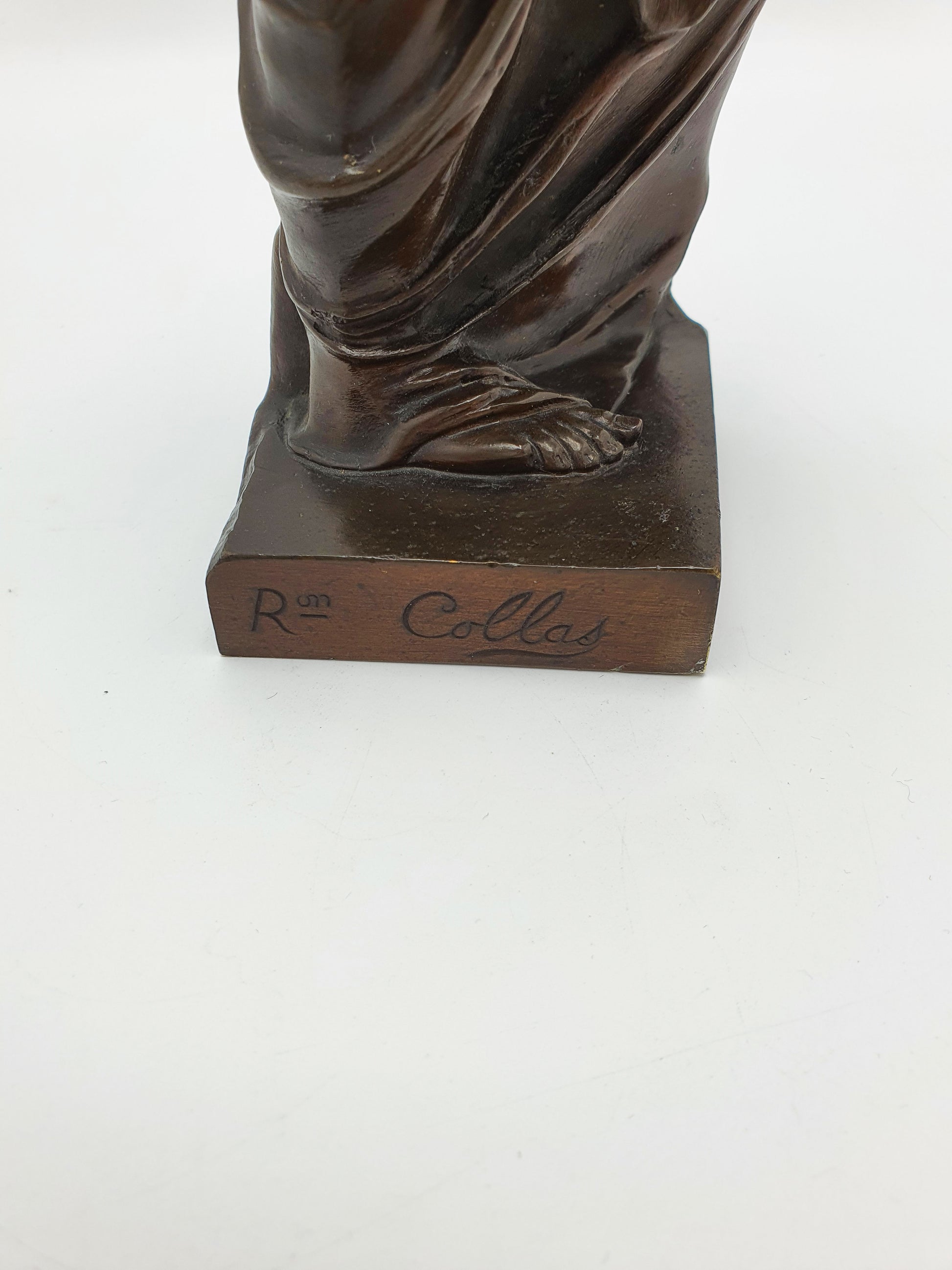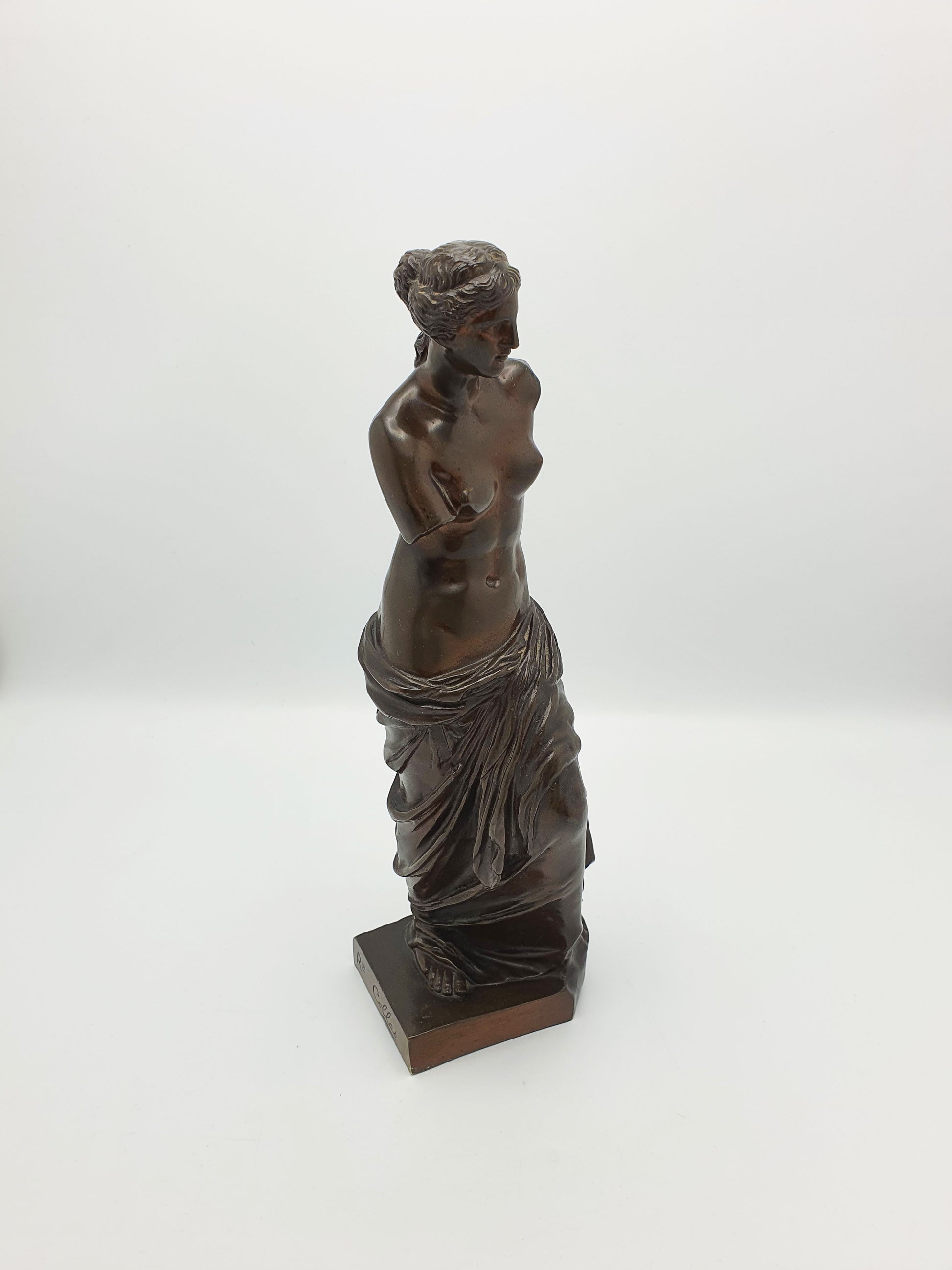 An Antique Bronze Venus de Milo Figurine by the French sculpture Ron Collas. Modelled after the famed Venus de Milo, this piece captures the essence of Hellenistic sculpture with its serene expression and poised stance. The dark, aged bronze gives the sculpture depth and texture, enhancing its visual appeal and adding to its antique charm. The sculpture is signed ‘Ron Collas' on the rear of its base – circa 1870.