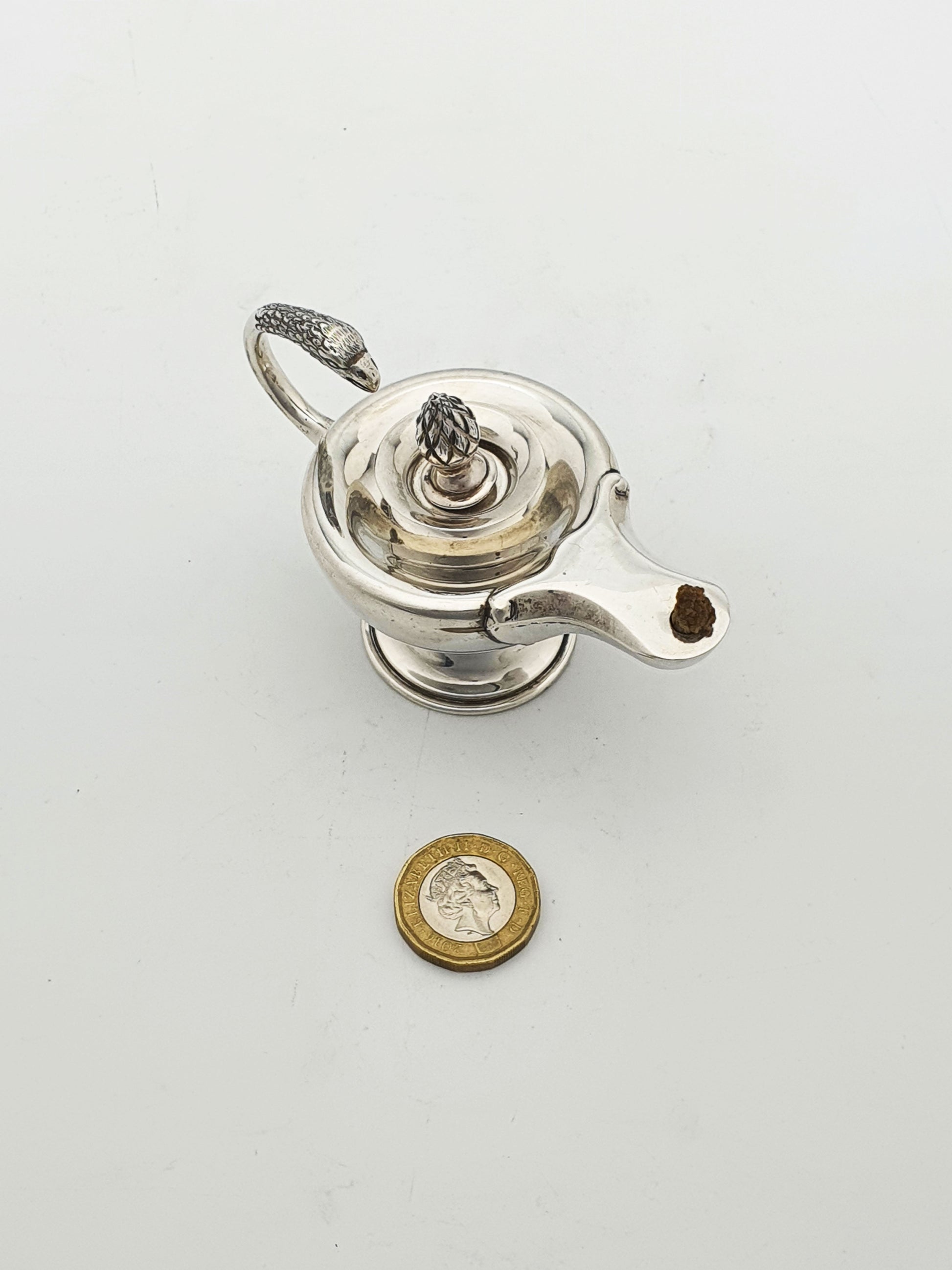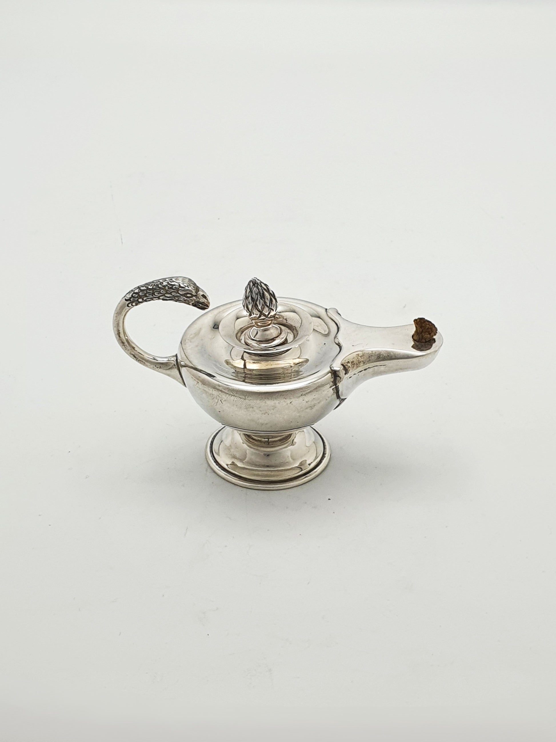 A Antique Sterling Silver Table Lighter modelled after an ancient oil lamp, complete with a finely cast eagle head handle. Includes a sterling silver insert and wick, allowing for easy refuelling and maintenance. This sterling lighter is hallmarked for Chester, 1924.