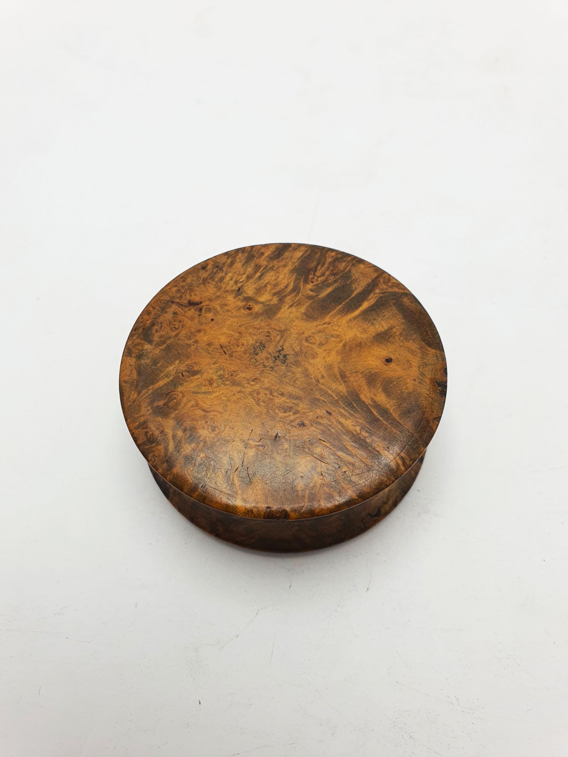 A Lovely Antique Victorian Burr Walnut Snuff Box with Painted Glass Inset of a delicate yellow flower, framed in a gilt brass bezel. This box features deep, complex grain patterns typical of fine burr walnut, offering visual richness and warmth.