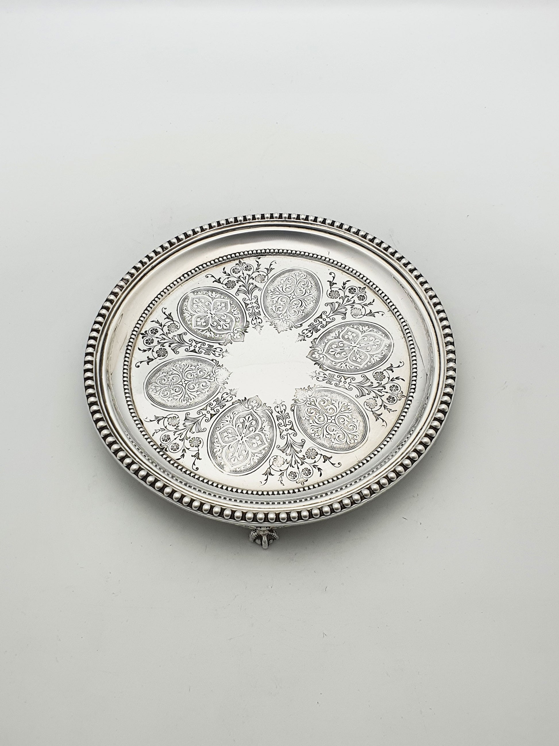 A Victorian silver plated round serving tray/salver with a bright finish and an elegant raised rim. The border is finished with a bold beaded edge that frames the piece with a classic, jewellery-like detail. The centre is finely engraved with a circular arrangement of cartouche medallions and scrolling foliage. The tray is raised on small ornamental feet, allowing it to sit proudly on a table or sideboard – circa 1890.