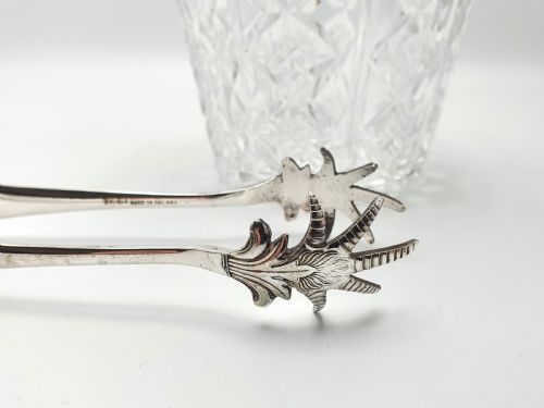 A Nice Art Deco Mappin & Webb Cut Glass and Silver-Plated Ice Bucket with a fold down handle and comes with silver plated ice tongs. The silver-plated rim of the bucket is marked for the renowned maker Mappin and Webb of London - circa 1930.