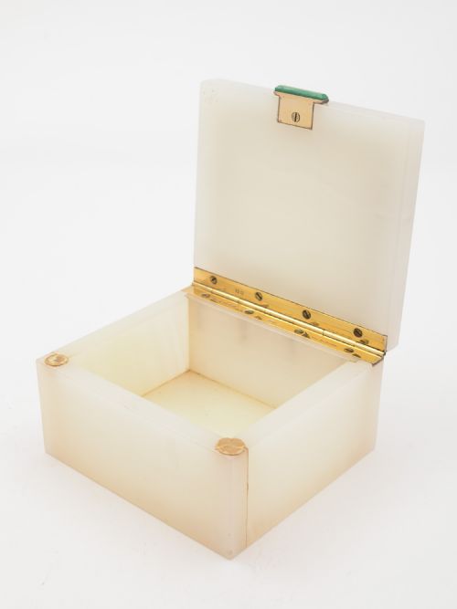 A charming Art Deco onyx box by Asprey. The top is inlaid with malachite and has a silver gilt hinge which is hallmarked London 1937. Measurements: Length: 4.75 Width: 3.5 Height: 2.25 In good condition.
