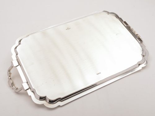 A lovely English Art Deco silver plated oblong serving tray with handles in the Art Deco style. Circa 1930. Worldwide first class tracked and signed for delivery is included in the price. Measurements: Length: 21 (approx 54.5cm) Width: 12 1/4 (approx 31.75cm) Height: 2 (approx 5cm) Weight: 2020g In good condition - any dark areas are shadows from the photography there is no damage to the silver plate.