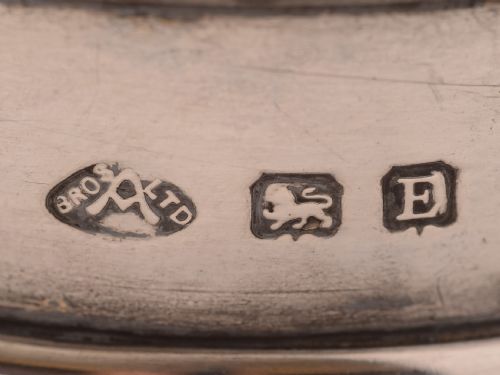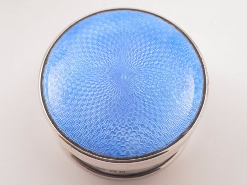 A nice English Art Deco cut glass bath salts jar with silver and blue guilloche enamelled lid. Has cut decoration to the glass body. Hallmarked Birmingham 1930 and marked A Bros Ltd for maker Adie Brothers. FREE worldwide delivery. Measurements: Height: 6 1/2 (approx 16.25cm) Diameter across base: 3 1/4 (approx 8cm) Total weight: 682g In good condition - no chips or cracks to glass or enamel and any dark areas are shadows from the photography.