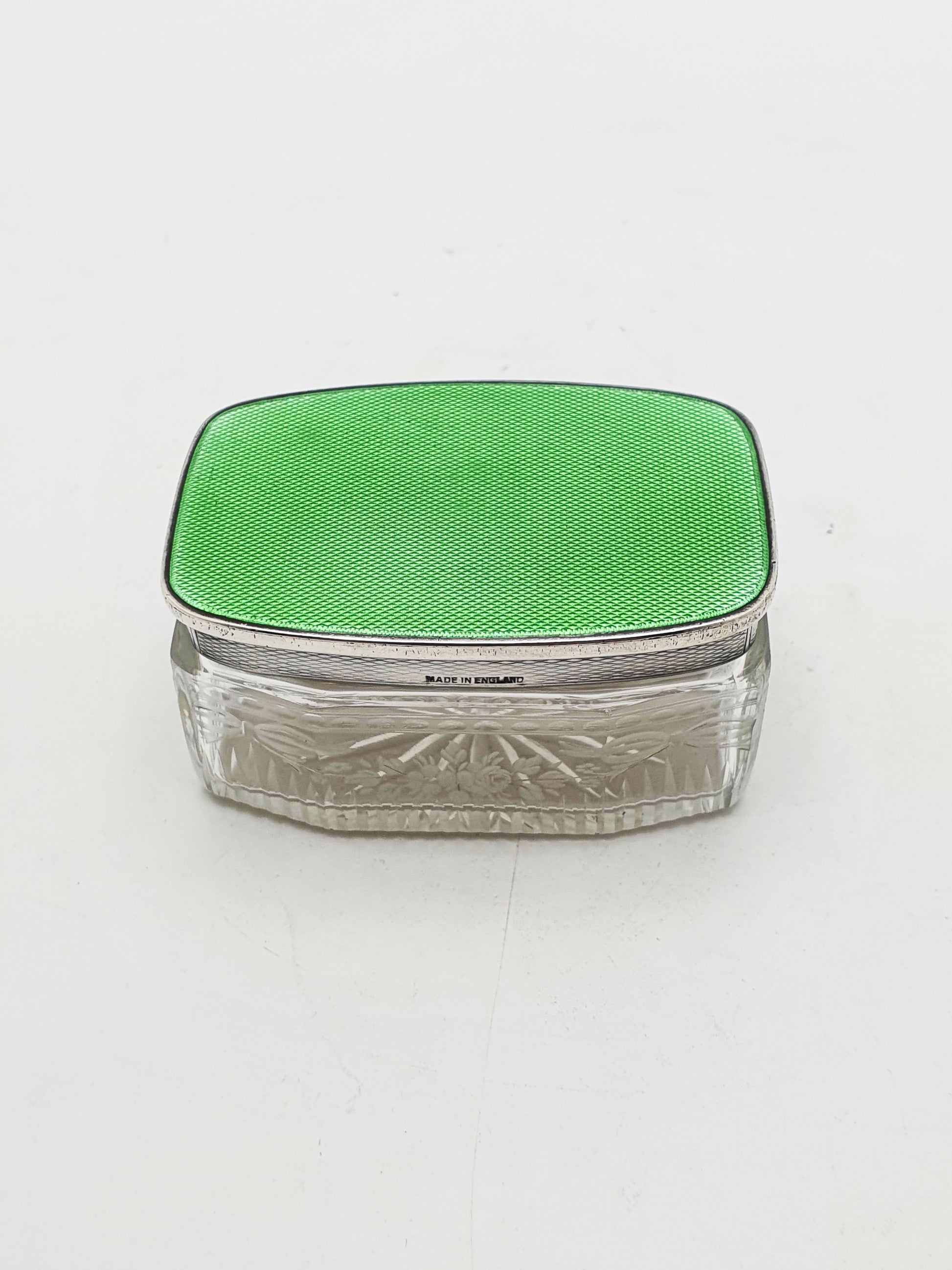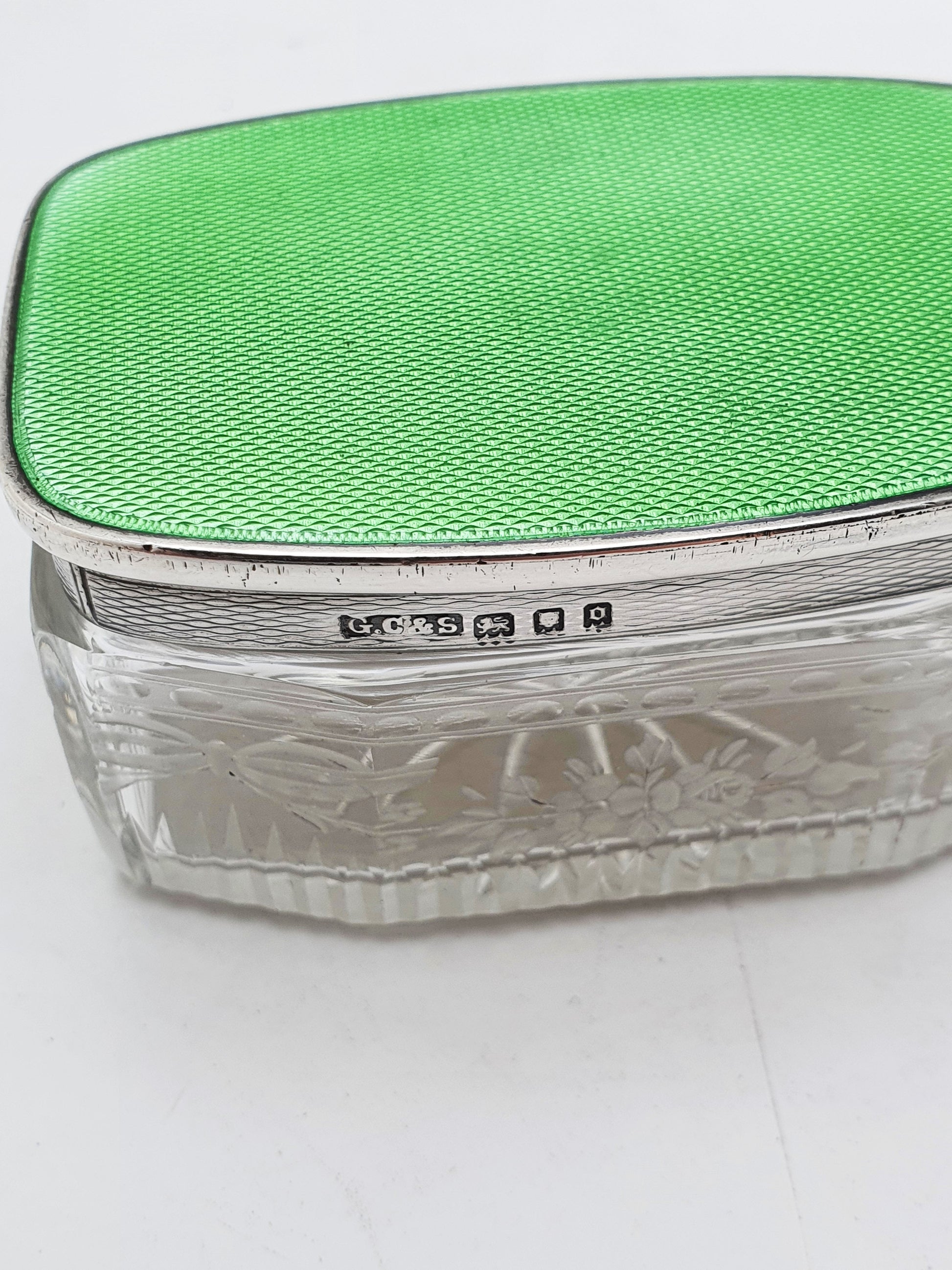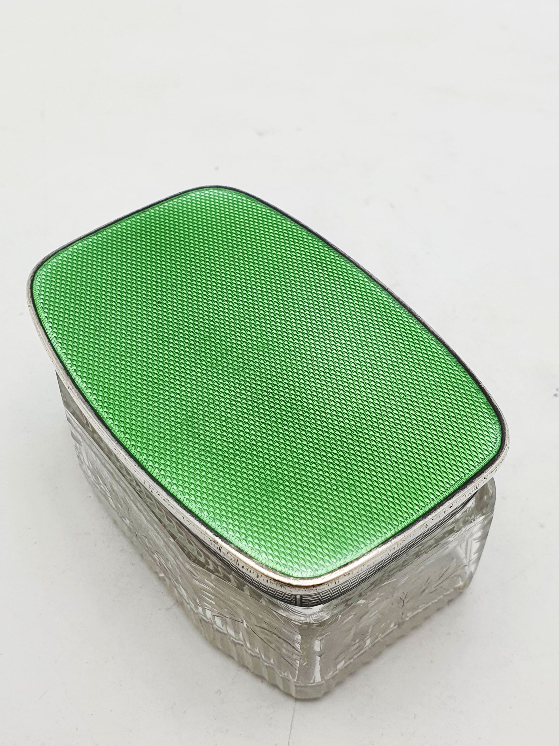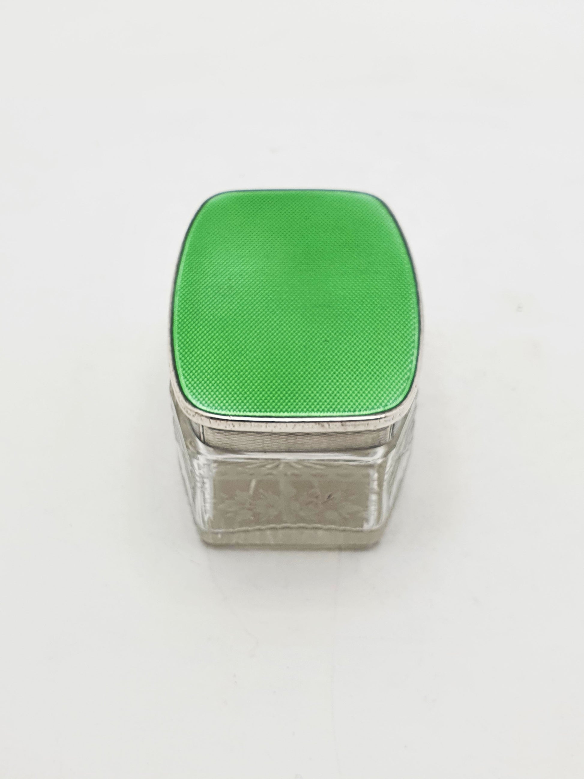 Its vivid apple green guilloché enamel lid, shimmering with intricate wave-patterned engine turning beneath a translucent glaze, sits atop a body of finely cut lead crystal. The lid is silver gilt on the underside, and the glass is hand-etched with floral and bow motifs - delicate, feminine, and finely executed.