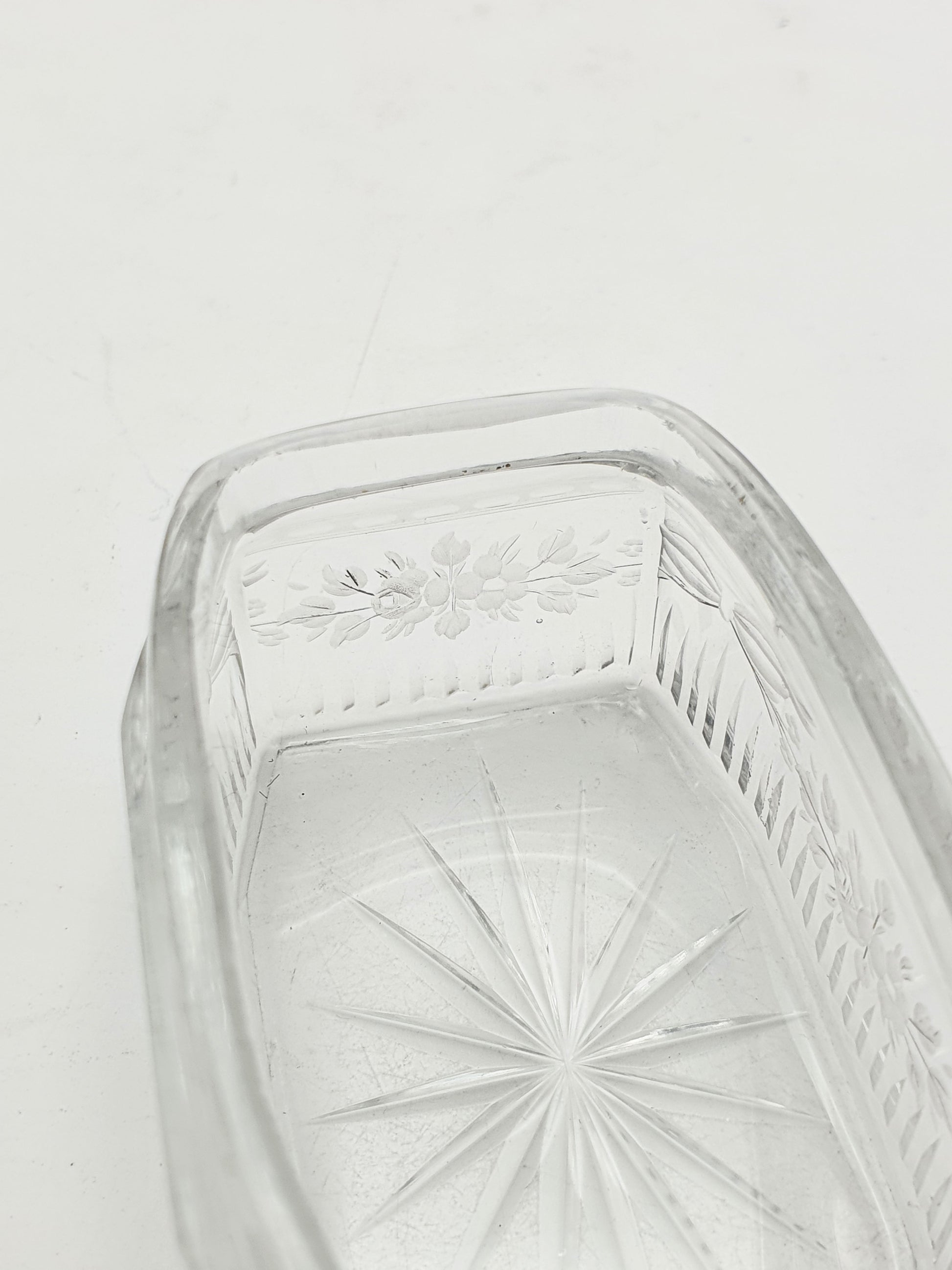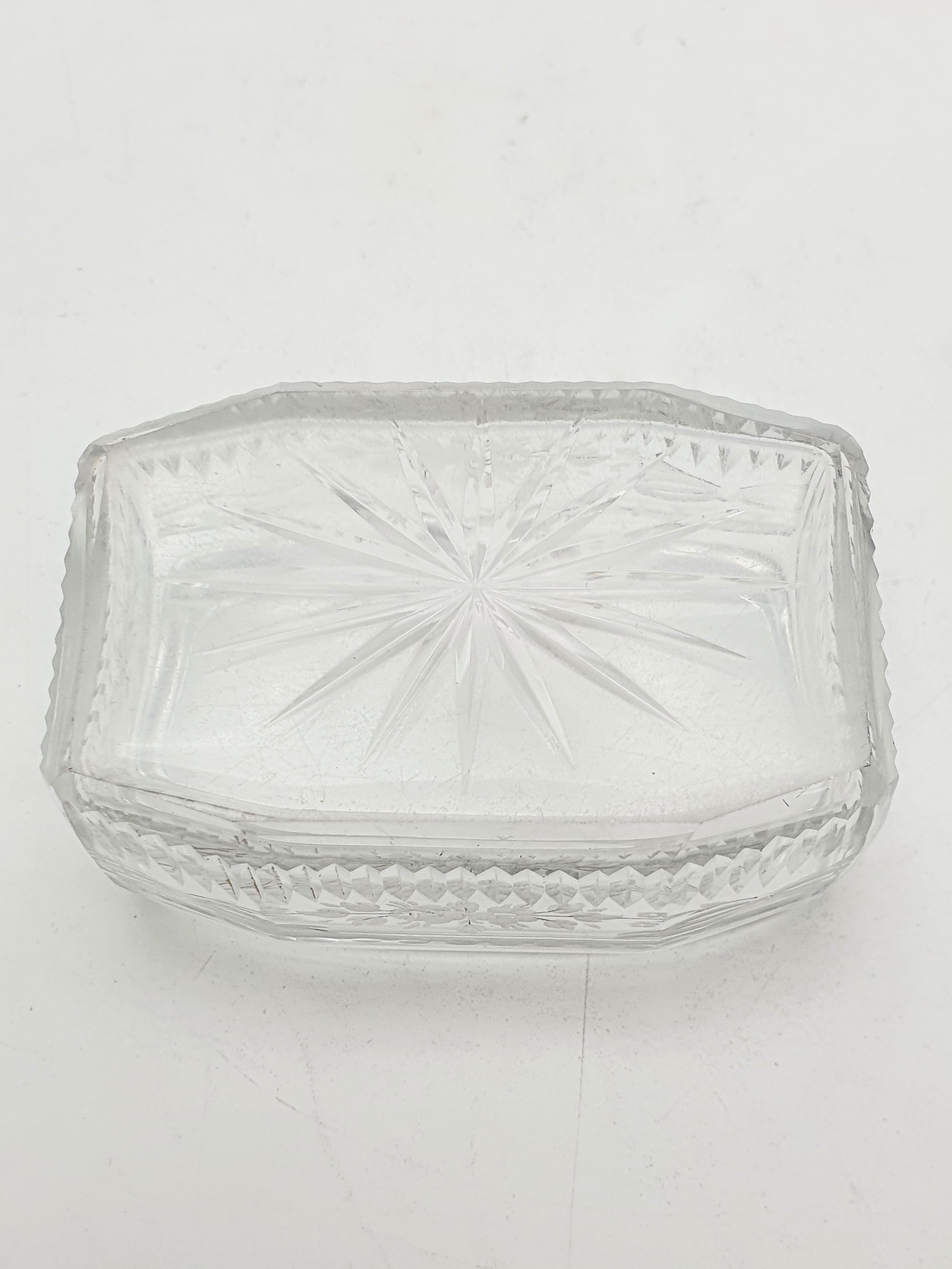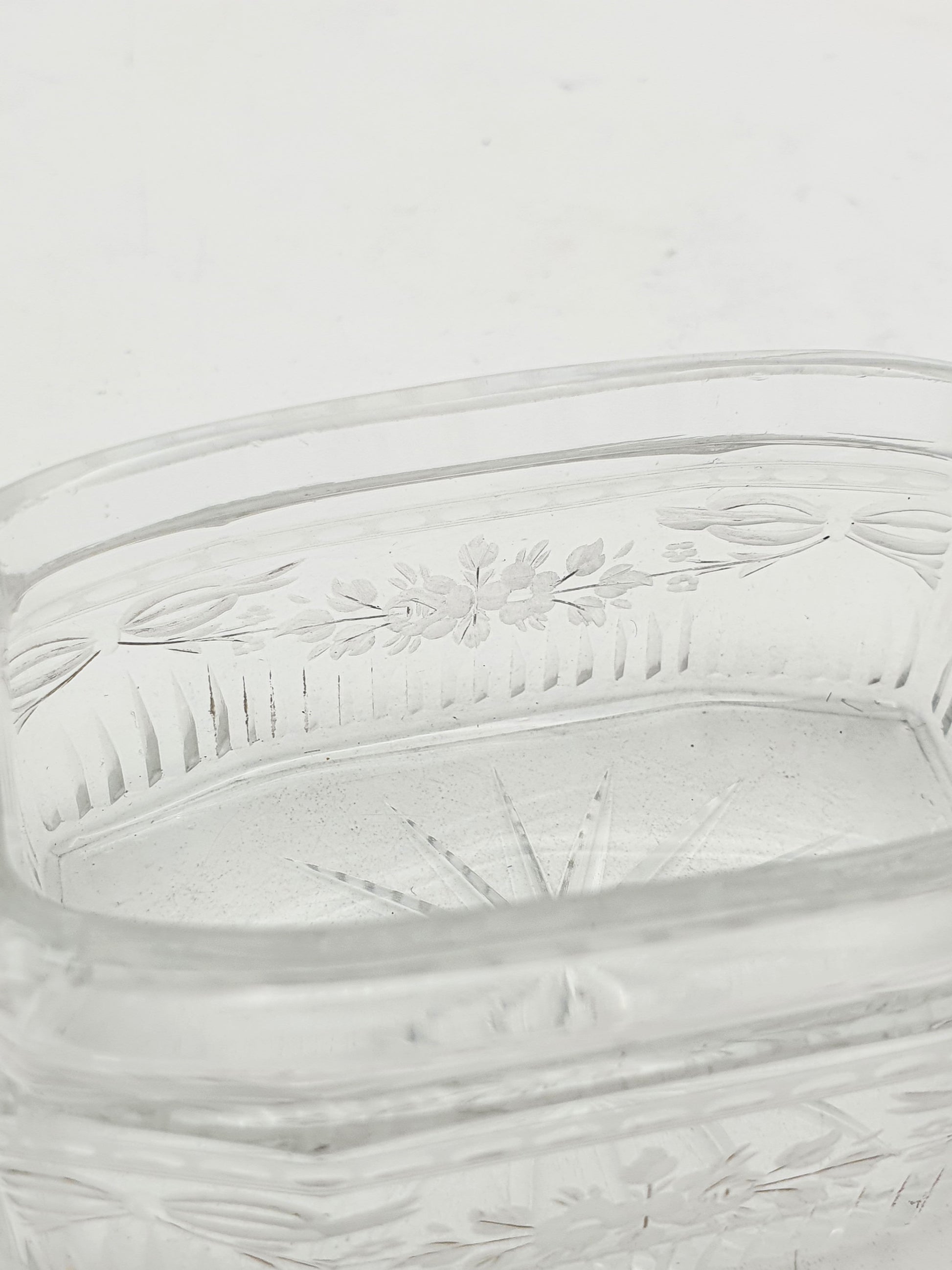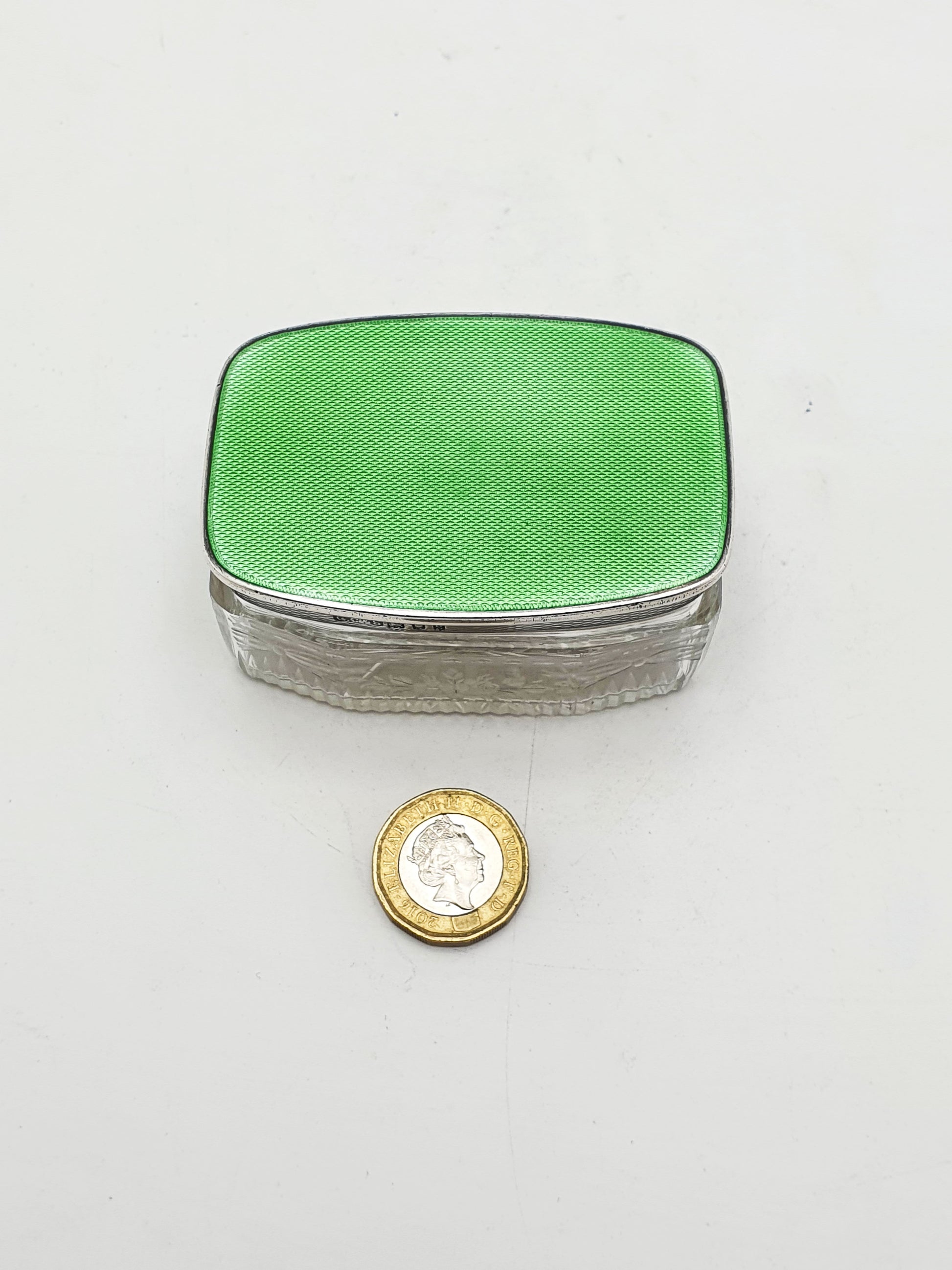 Its vivid apple green guilloché enamel lid, shimmering with intricate wave-patterned engine turning beneath a translucent glaze, sits atop a body of finely cut lead crystal. The lid is silver gilt on the underside, and the glass is hand-etched with floral and bow motifs - delicate, feminine, and finely executed.