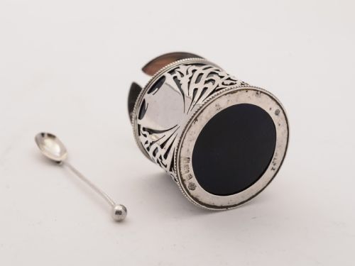 A lovely English silver Art Nouveau mustard pot with cobalt blue liner and pierced decoration to main body. Has flip up lid and silver mustard spoon. The pot is hallmarked Birmingham 1903 and the spoon is hallmarked Birmingham 1894. FREE worldwide delivery. Measurements: Height: 2 1/4 (approx 5.5cm) Length: 3 (approx 7.75cm) Width: 2 1/4 (approx 5.5cm) Total weight: 152g In good condition- any dark areas are shadows from the photography.