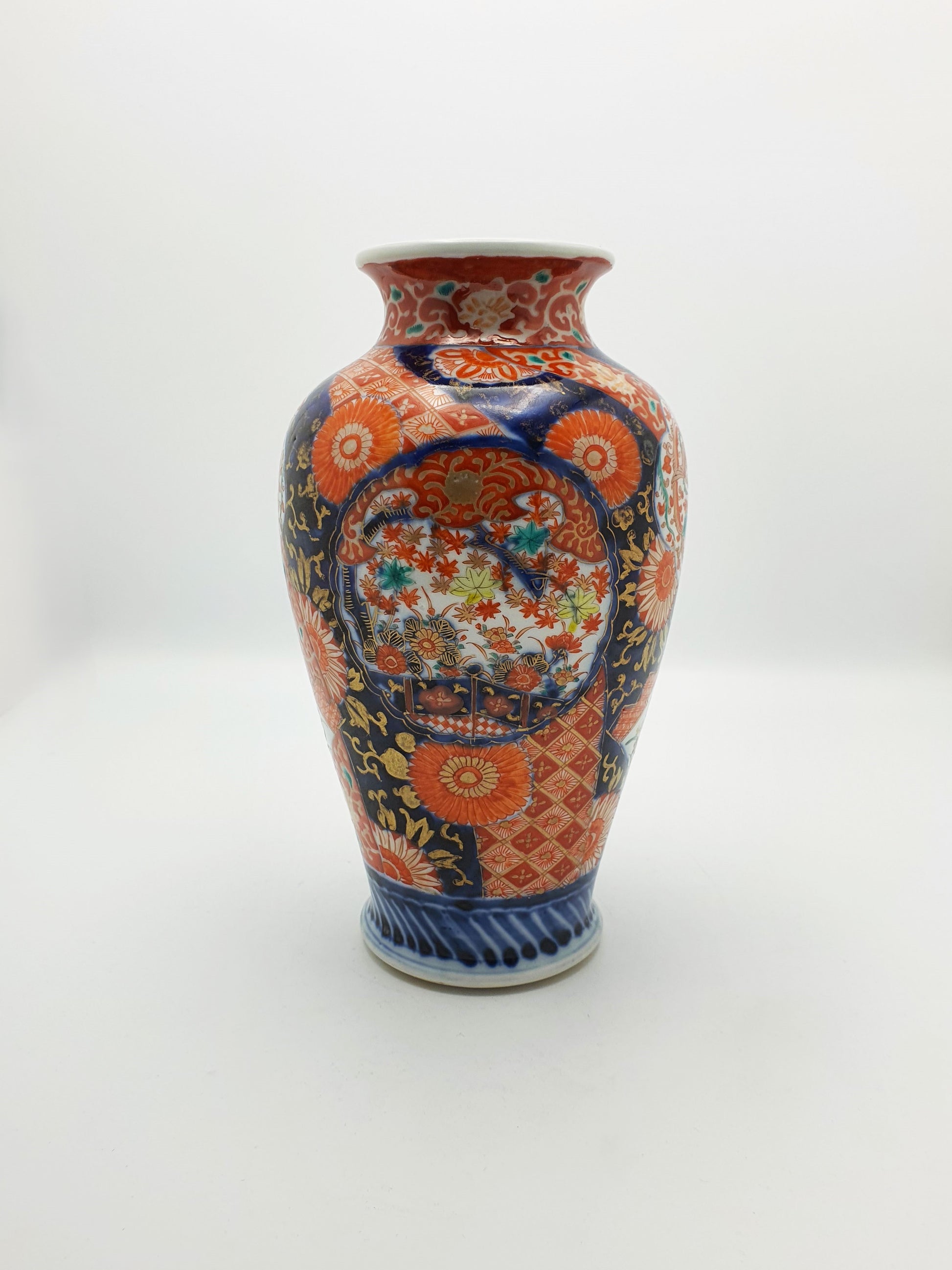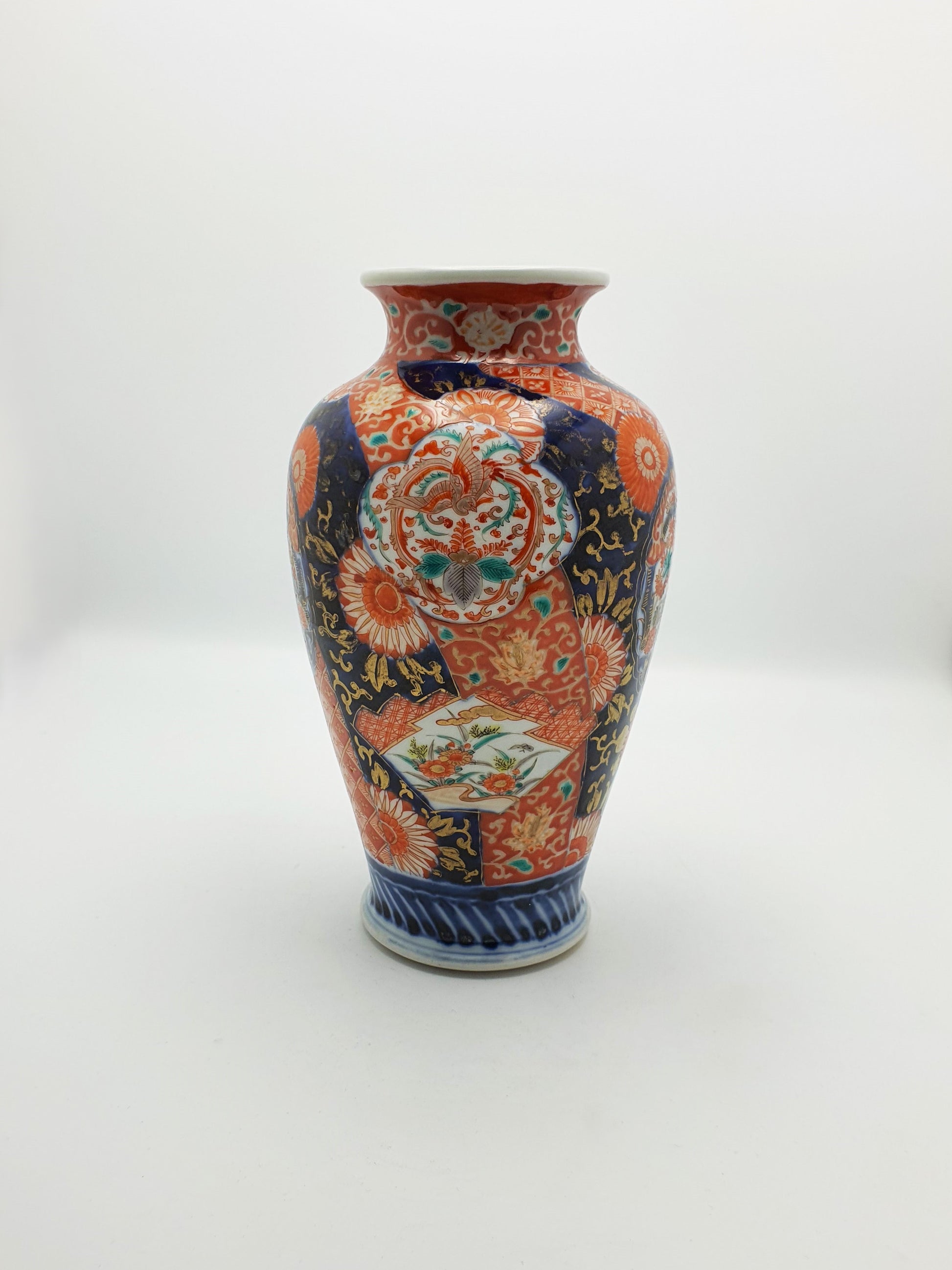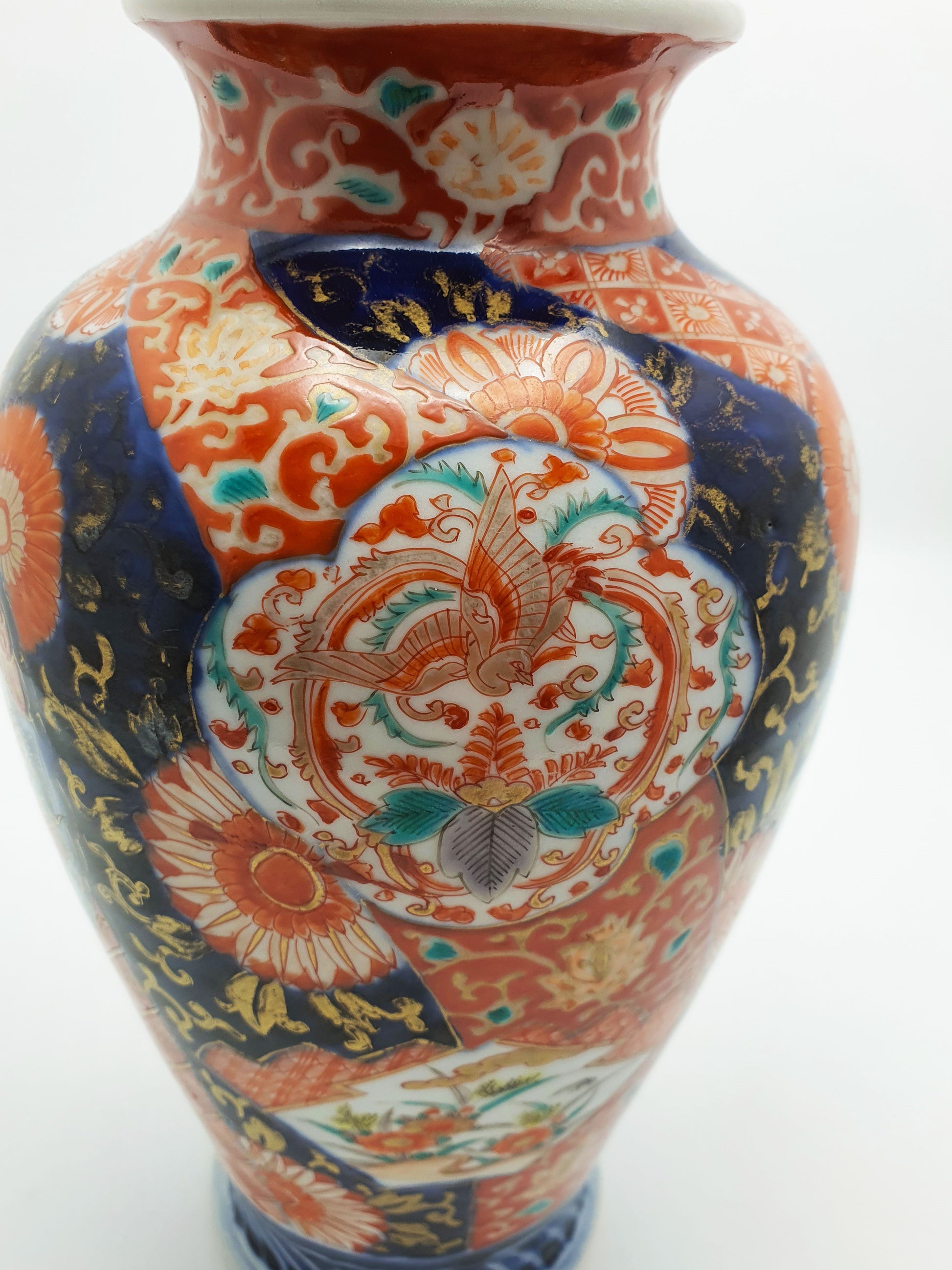 A Beautiful Antique Japanese Imari Vase decorated in the traditional Imari palette of cobalt blue, iron red, and gold. The vase features intricately painted floral motifs, stylized phoenixes, and patterned reserves in a harmonious, asymmetrical composition – circa 1900.