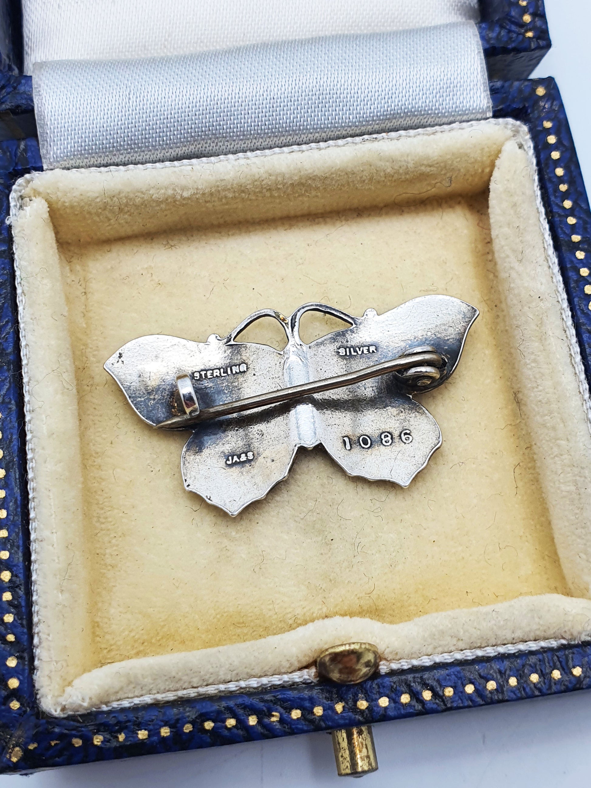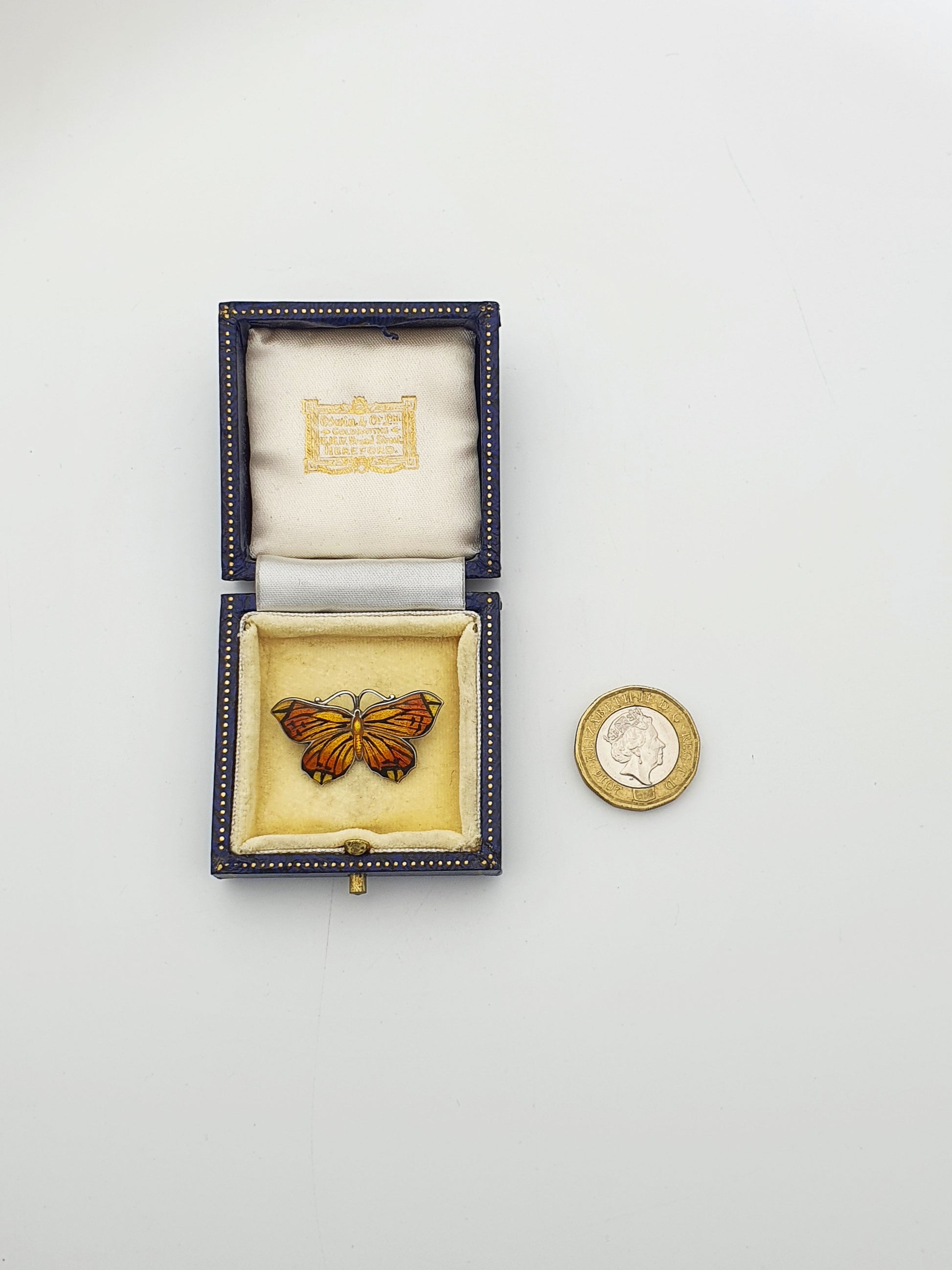 A Beautiful Antique Butterfly Brooch crafted in Sterling Silver and richly adorned with vibrant orange and black enamel. Presented in a velvet and silk lined presentation box, it captures the delicate beauty of nature with old-world elegance – circa 1920.