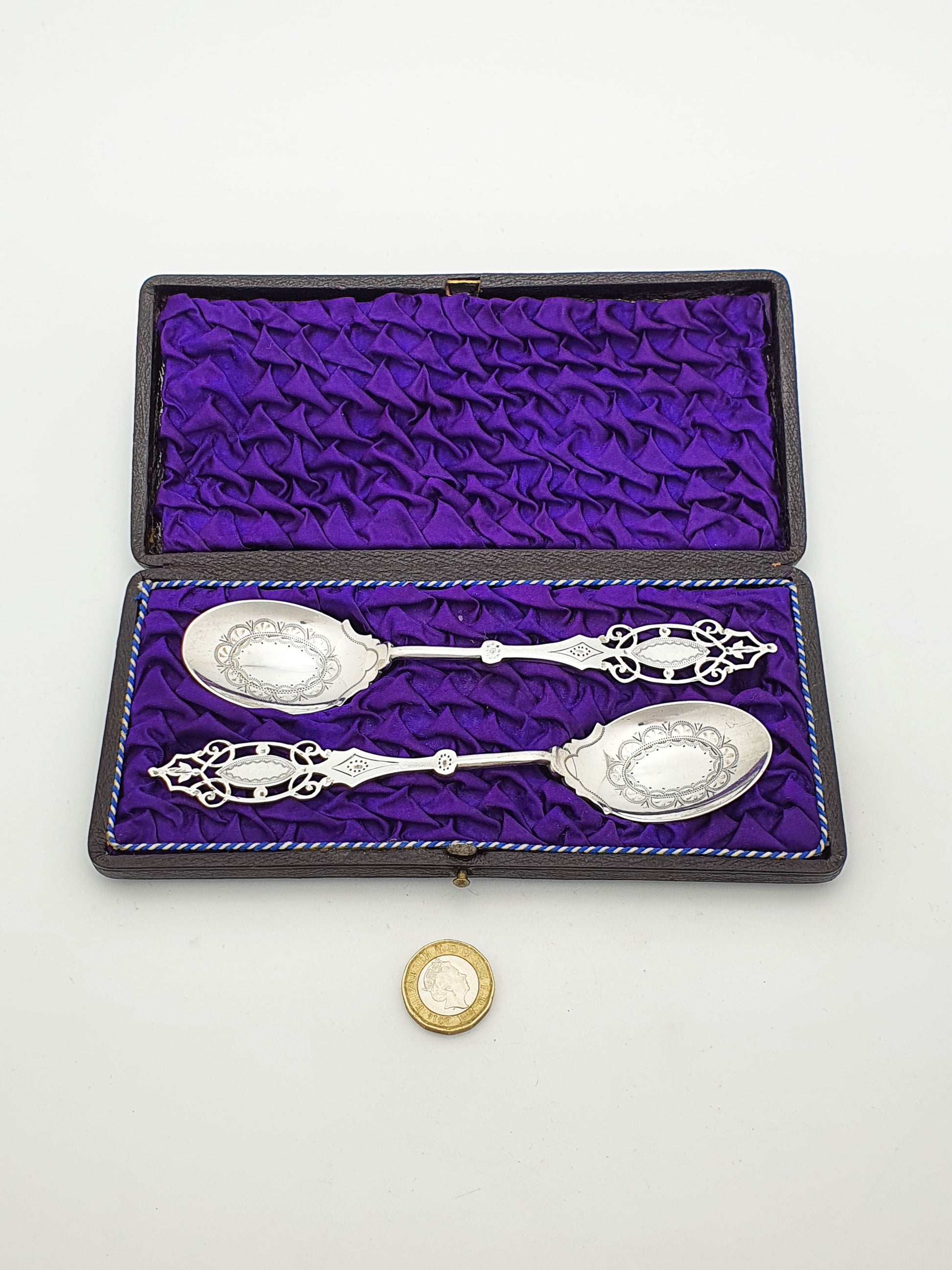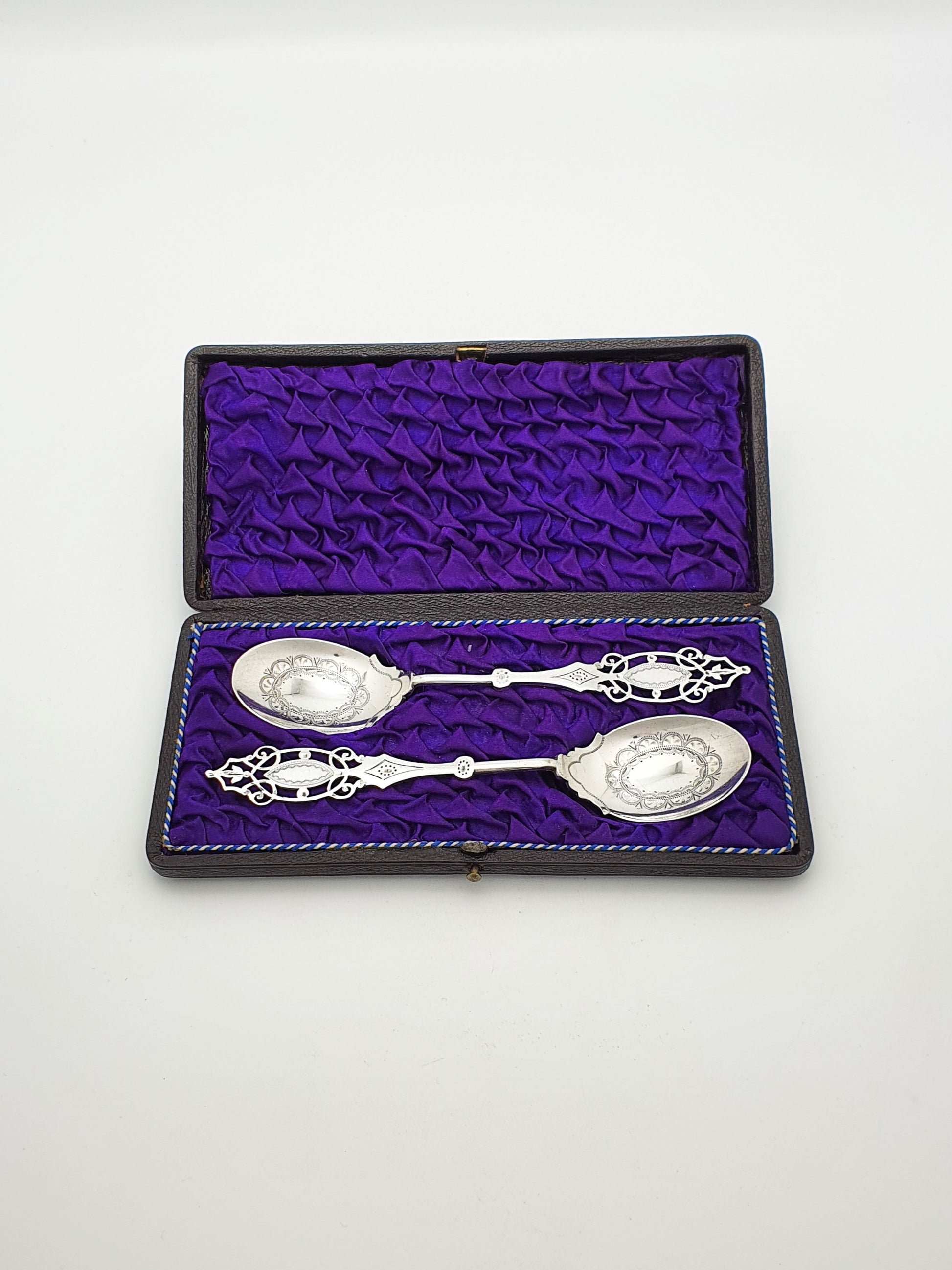 A Beautiful pair of Antique George V Sterling Silver Preserve Spoons with ornate pierced handles and finely engraved bowls, these spoons are presented in a ruched purple satin and velvet case. Hallmarked for Sheffield, 1919 and marked for the renowned make ‘Mappin and Webb’.