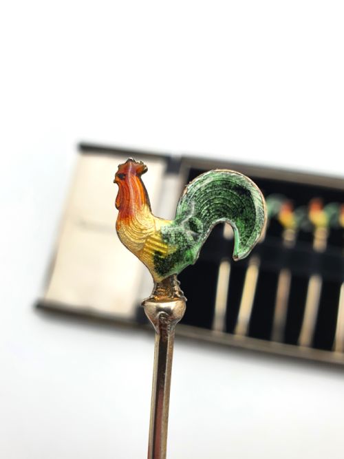 Cased Set of Six Enamelled and Silver Cocktail Sticks styled as coloured cockerels. Each stick is stamped Sterling Silver (.925 quality). They come in their original velvet and silk lined case - circa 1930.