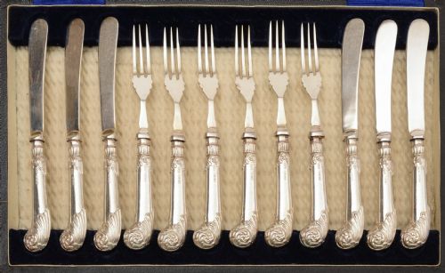 A fabulous cased English dessert set with silver pistol grip handles and silver plated knives and forks. Presented in velvet and silk lined box. Hallmarked Sheffield 1925 and marked B&D for the maker Boodle & Dunthorne. FREE worldwide delivery. Measurements: Knife length: 6 1/2 (approx 16.25 cm) Fork length: 6 1/4 (approx 15.5cm) Box height: 1 (approx 2.5cm) Box length: 12 1/2 (approx 31.25cm) Box width: 8 (approx 20cm) Total weight: 831g In good condition - any dark areas are shadows from the photography there is no damage to the silver or silver plate.