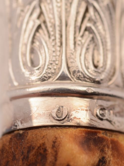 Nice cased English Victorian antler-handled salad servers with silver plated knife and fork and silver finials and ends. Have engraved decoration to silver and silver plate. Presented in original mahogany velvet and silk lined box. Handles are hallmarked Sheffield 1883 and marked JB for the maker James Barber FREE worldwide delivery. Measurements: Box height: 1 3/4 (approx 4.5cm) Box length: 14 1/2 (approx 36.25cm) Box width: 5 (approx 12.5cm) Server length: 10 (approx 25cm) Total weight: 949g In good condition - Any dark areas are shadows from the photography there is no damage to the silver plate.