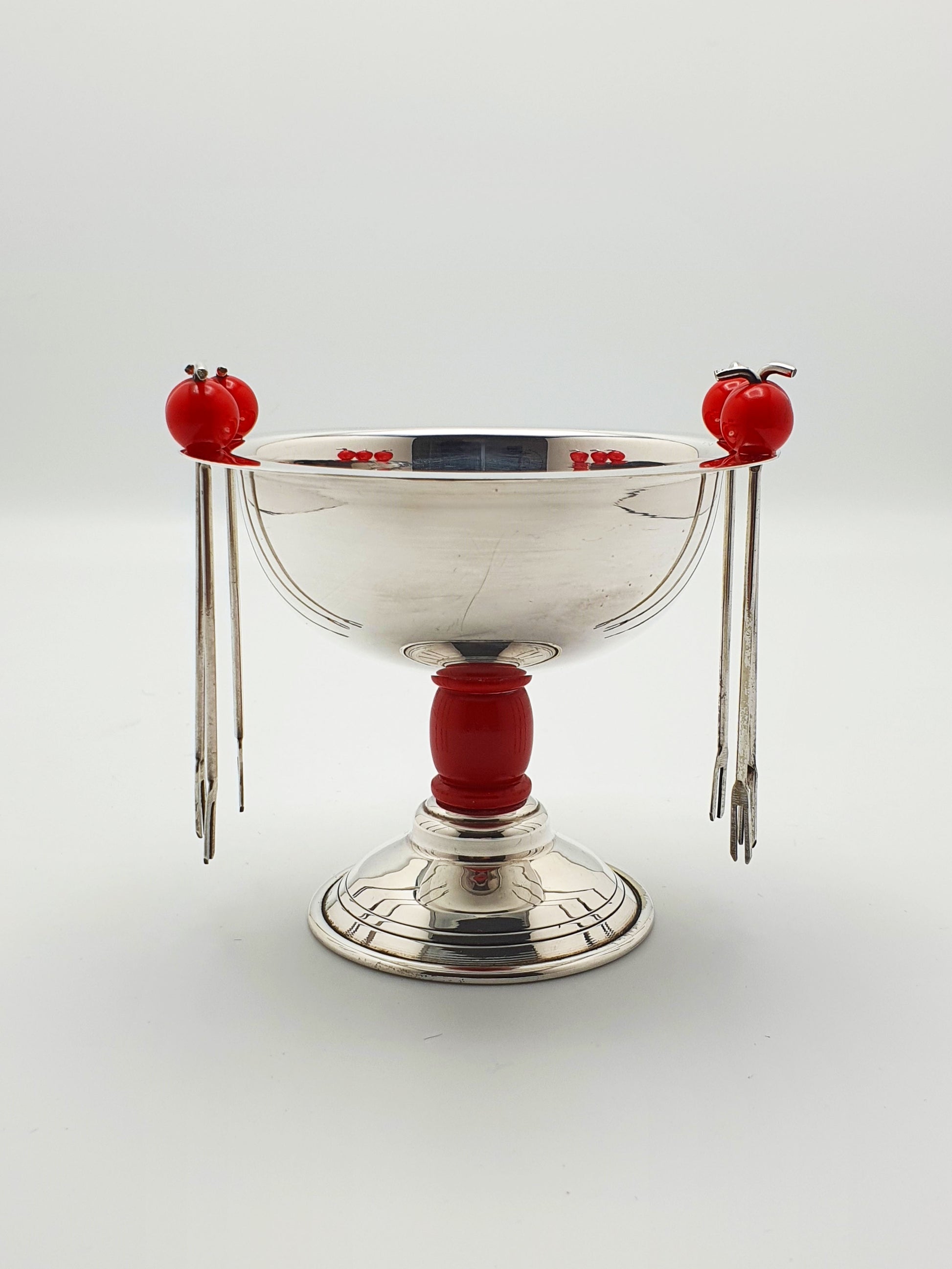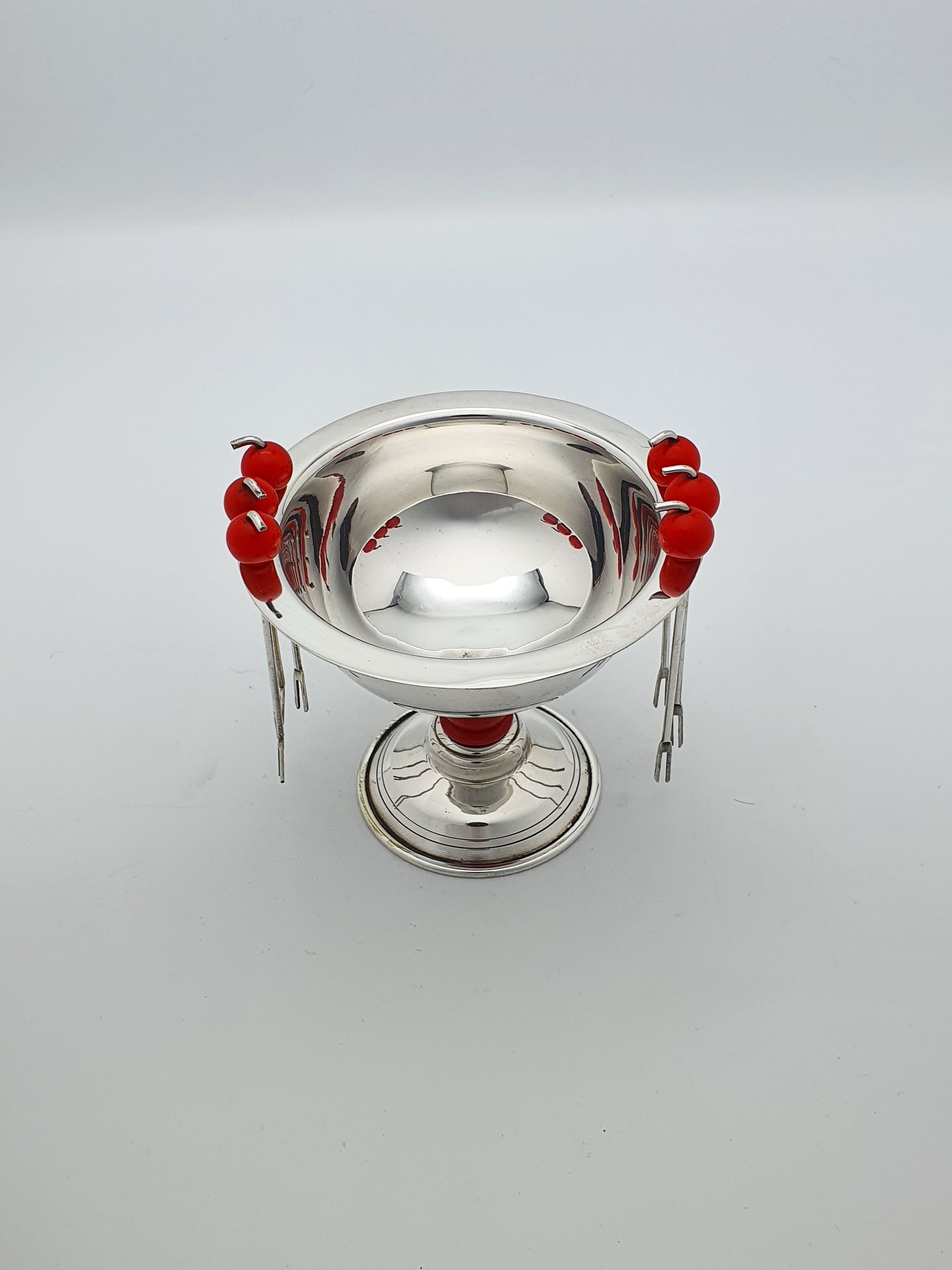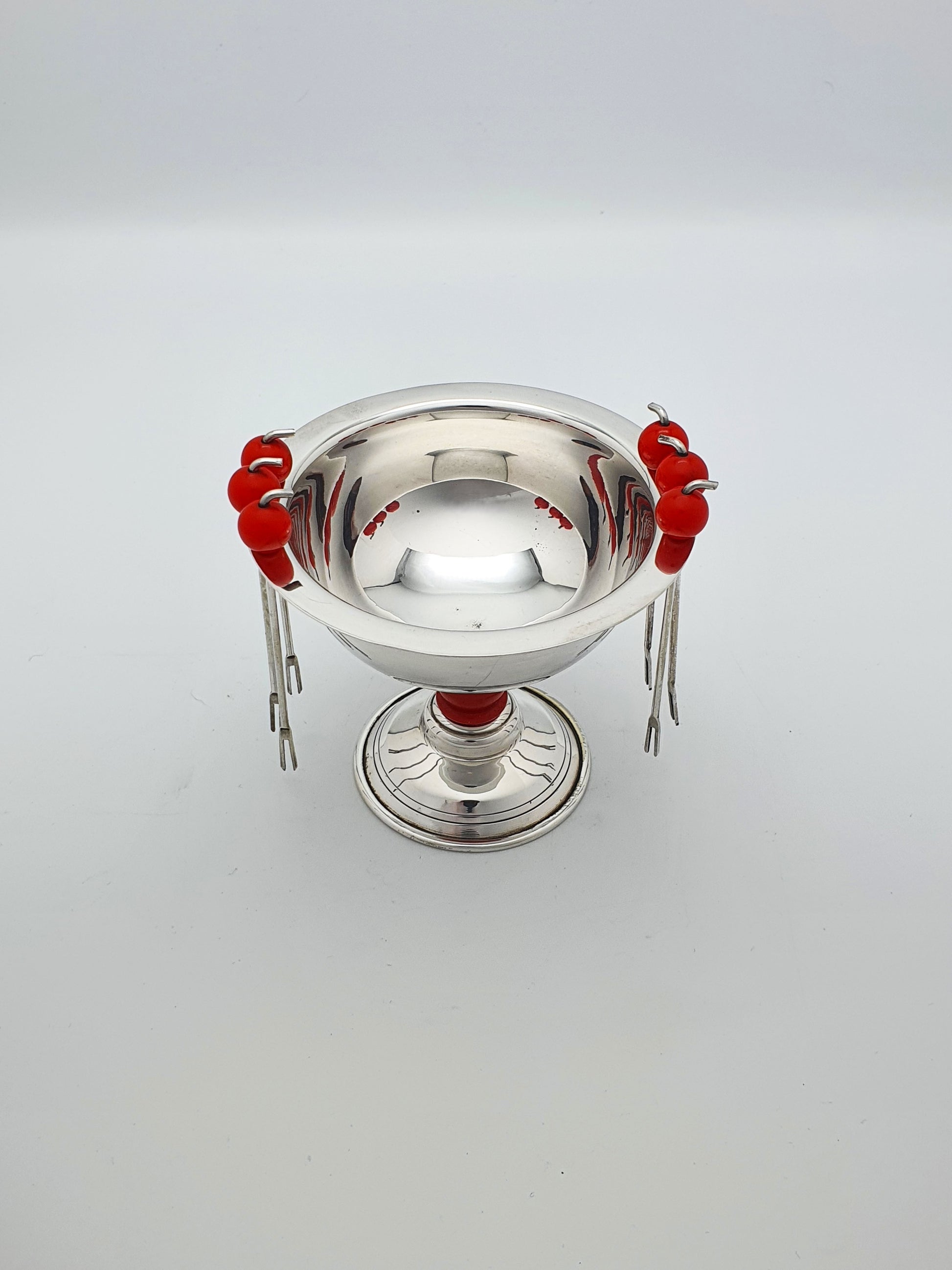 A Charming Mid-Century Silver-Plated Cocktail Pick Set complete with six miniature forks suspended from cherry red beaded holders. Stylishly perched on a pedestal base with matching Bakelite detail, this set is as practical as it is decorative – circa 1950.