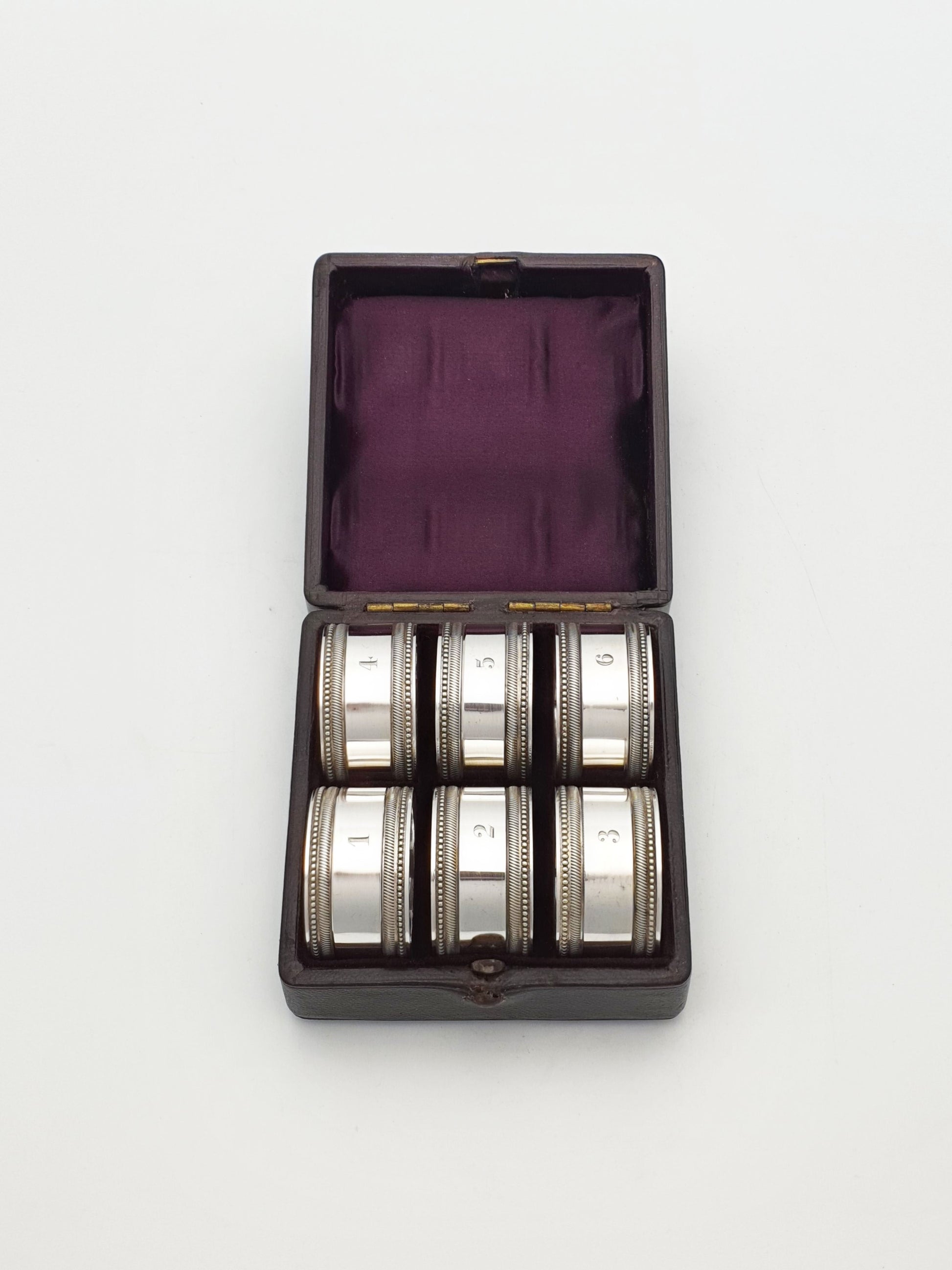 A Charming Set of Six Antique Silver-Plated Napkin Rings, each engraved with a number (1 through 6) and beautifully presented in their original velvet-lined case. Each ring features a smooth, polished surface with a fine beaded border
