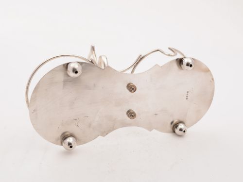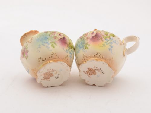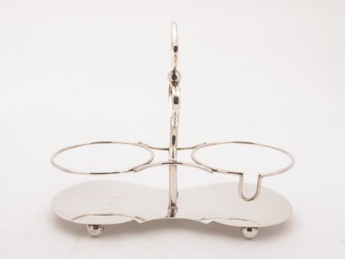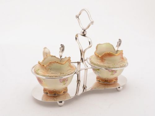 A nice English Edwardian china sugar bowl and jug with printed flower decoration which sit in silver plated stand which has a central carrying handle and sits on 4 ball feet. Comes with a silver plated sifter spoon and cream ladle. Circa 1905. FREE worldwide delivery. Measurements: Height: 7 (approx 17.5cm) Length: 9 (approx 23.75cm) Width: 4 (approx 10cm) Total weight: 571g In good condition - no chips or cracks to china and any dark areas are shadows from the photography there is no damage to the silver plate..