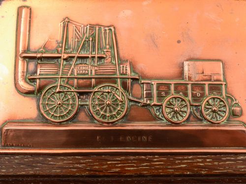 An interesting English copper and oak commemorative plaque depicting No 1 Engine which pulled the inaugural train on the opening day of the Stockton and Darlington Railway (S&DR) in 1825 Bulmers Stone is a relic of the Ice Age upon which a town crier called Willy Bulmer would stand and read out the contents of the newspapers. Registration number: 541742 which dates this as 1909. FREE worldwide delivery. Measurements: Length: 11 (approx 27.5cm) Width: 5 1/4 (approx 13cm) Depth: 3/4 (approx 1.75cm) Weight: 619g In good condition