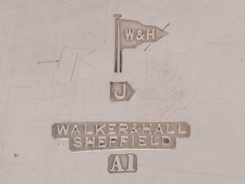 A lovely English glass vase with diamond cut decoration which sits in triangular silver plated stand. Circa 1920. Made by the renowned maker Walker & Hall. Worldwide first class tracked and signed for delivery is included in the price. Measurements: Height: 8 3/4 (approx 22.5cm) Diameter across top: 4 (approx 10cm) In good condition - no chips or cracks to the glass.