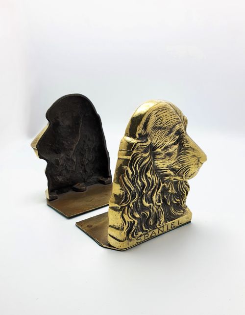 A lovely pair of English Edwardian brass bookends with nicely modelled spaniel heads. Perfect for dog lovers and collectors alike these antique bookends would look great on any bookshelf. Measurements: Height: 5 1/2 (approx. 14cm) Width: 4 3/4 (approx. 12cm) Depth: 3 (approx. 7.5cm) Total weight: 1100g In good condition.