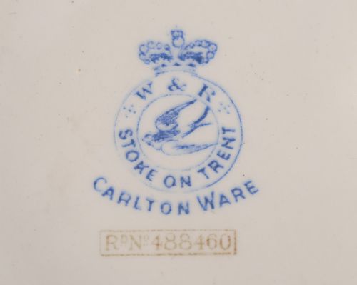 Really pretty Edwardian silver plated cake stand with 2 shell shaped dishes made by Carlton Ware. Stand by G B & S Butler & Co. Trinity Works. Registration number on the plates dates them as 1903. Lovely soft colours on the plates. In excellent condition. Stands 9 1/2 high x 7 1/4 width. Plates approx. 6