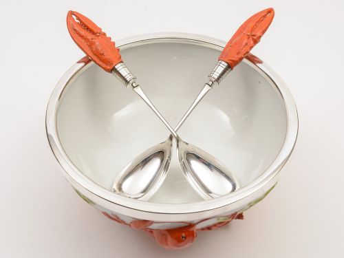 A superb Edwardian continental china salad bow with lobsters crawling up the outside of bowl which has silver plated protective rim. Also sits on shell feet with matching silver plated and china lobster claw handled servers. Circa 1900. Worldwide first class tracked and signed for delivery is included in the price. Measurements: Diameter across top of bowl: 10 (approx 25cm) Height: 5 (approx 12.5cm) Length of servers: 11 (approx 28cm) I have come across these before but never as nice as this one or in such good condition! In good condition