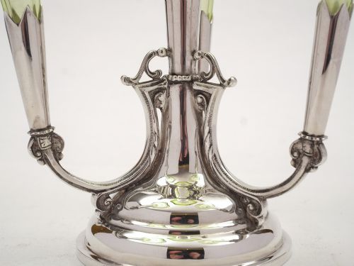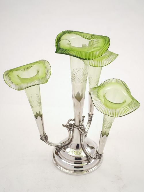 A good Edwardian silver plated eperne with green glass flutes which flare at the top and have cut decoration. Circa 1905. Worldwide first class tracked and signed for delivery is included in the price. Measurements: Height: 12 (approx 30.5cm) Width (flute to flute): 10 (approx 25.5cm) Diameter across base: 5 (approx 12.75cm) In good condition - any dark areas are shadows from the photography there is no wear to silver plate and no chips or cracks to the glass.