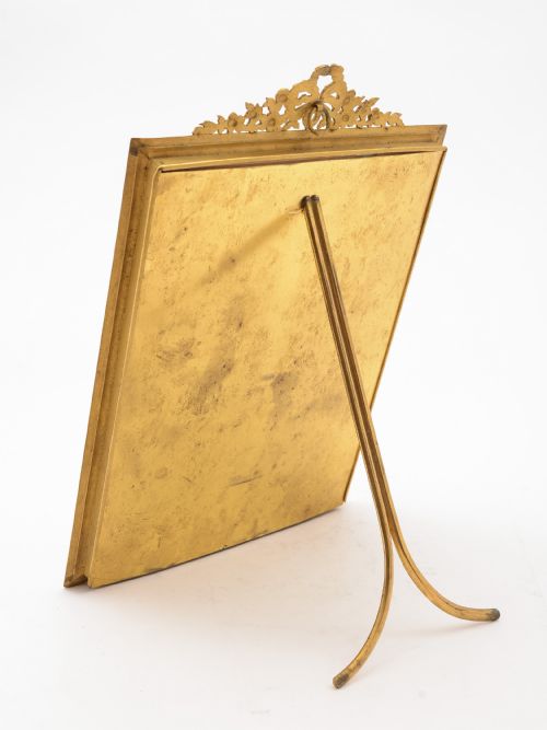A fabulous good-sized English Edwardian gilded bronze picture frame with strut back stand and embossed with lovely garland decoration to top. Circa 1905. FREE worldwide delivery. Measurements: Height: 11 1/4 (approx 28cm) Length: 7 1/2 (approx 18.75cm) Width: 1/2 (approx 1.25cm) Picture height: 8 1/2 (approx 21.25cm) Picture width: 6 1/2 (approx 16.25cm) Total weight: 675g (approx) In good condition - no chips or cracks to glass