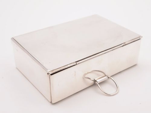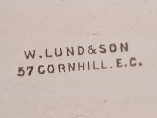 A good English Edwardian silver plated sandwich box which sits in leather case made by W Lund & Son 57 Cornhill EC London. This box was probably used for hunting etc. Circa 1905. Worldwide first class tracked and signed for delivery is included in the price. Measurements: Height: 1 1/2 (approx 3.75cm) Length: 4 3/4 (approx 11.75cm) Width: 3 (approx 7.75cm) Total weight (including case): 511g In good condition - any dark areas are shadows from the photography there is no wear to the silver plate.