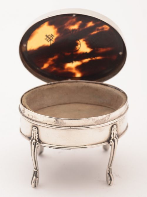 A fabulous English Edwardian silver ring box with tortoise shell hinged lid which has inlaid silver decoration. Stands on 4 legs and has velvet interior. Hallmarked London 1908. FREE worldwide delivery. Measurements: Height: 2 1/4 (approx 5.5cm) Length: 3 (approx 7.5cm) Width: 2 (approx 5cm) Weight: 39g In good condition - any dark areas are shadows from the photography