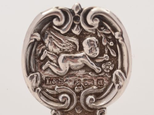 An Edwardian continental silver miniature suite of furniture with ornate cherub decoration. The entire set is hallmarked Birmingham and the dates range from 1901-1903 There is a sofa (1901) two chairs (1902) and one table (1903). Measurements: Sofa: 2 1/4 long X 3/4 depth X 2 high Chairs: 3/4 long X 3/4 depth X 1 7/8 high Table: 1 3/4 long X 1 1/8 depth X 1 1/8 high In good condition