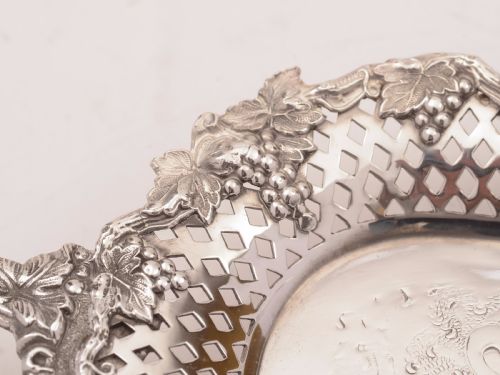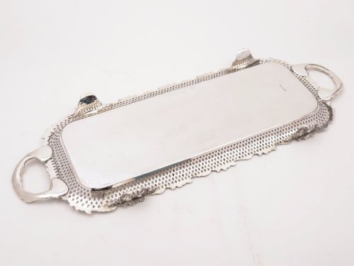 A stunning English Edwardian silver plated oblong tray with fruit and vine embossed decoration to edged and handles and embossed foliage pattern to centre of tray. Has pierced decoration to edges and stands on 4 embossed grape and vine leaf feet. Ideal drinks or sandwich tray! Circa 1905. FREE worldwide delivery. Measurements: Height: 1 1/2 (approx 3.75cm) Length: 24 1/2 (approx 61.25cm) Width: 8 (approx 20cm) Weight: 1580g In good condition - any dark areas are shadows from the photography there is no damage to the silver plate.