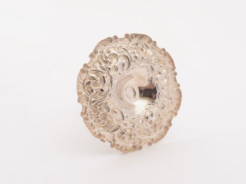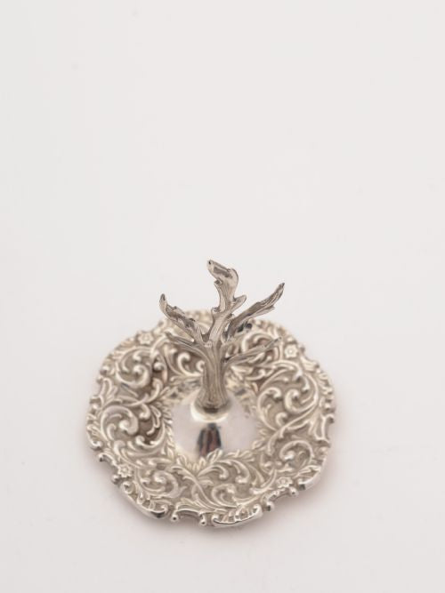 A lovely English Edwardian silver ring tree with embossed decoration to base. Hallmarked Birmingham 1904. FREE worldwide delivery. Measurements: Height: 3 1/4 (approx 8cm) Diameter across base: 3 1/2 (approx 8.75cm) Weight: 33g In good condition - any dark areas are shadows from the photography.