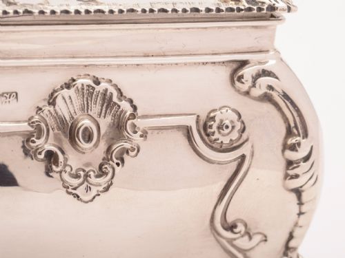A fabulous English Edwardian silver tea caddy with hinged lid embossed decoration and stands on 4 feet. Marked G.N over R.H into a shield for the maker George Nathan & Ridley Hayes hallmarked Chester 1908. FREE worldwide delivery. Measurements: Height: 4 1/2 (approx 11.25cm) Length: 4 (approx 10cm) Width: 2 (approx 5cm) Silver weight: 236g (approx 7.6 troy ounces) In good condition - any dark areas are shadows from the photography.