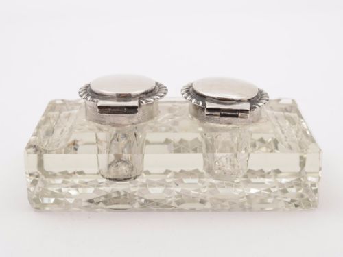 A nice Edwardian silver topped cut glass double ink pot with pen tray and hobnail cut base. Would have probably be used for 2 different coloured inks. Hallmarked Birmingham 1901. Worldwide first class tracked and signed for delivery is included in the price. Measurements: Height: 2 1/2 (approx 6.25cm) Width: 4 3/4 (approx 11.75cm) Depth: 2 1/2 (approx 6.25cm) Total weight: 466g In good condition - any dark areas are shadows from the photography there is no damage to the silver plate and no chips or cracks to the glass.