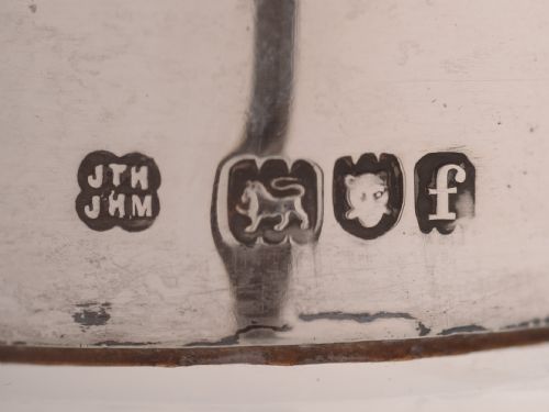 A nice English Edwardian glass glug glug decanter with silver double pouring spout. Hallmarked London 1901 and marked J T H J H M for the renowned makers John Thomas Heath & John Hartshorne Middleton of Hukin & Heath. FREE worldwide delivery. Measurements: Height: 11 (approx 27.5cm) Diameter across base: 4 1/4 (approx 10.5cm) Total weight: 920g In good condition - no chips or cracks to glass and any dark areas are shadows from the photography.