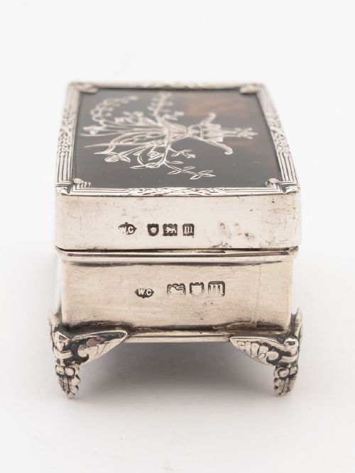 A nice English Edwardian silver and tortoise shell ring box with flower decoration to top original velvet interior and stands on 4 feet. Has a pull of lid. Hallmarked London 1907 and marked W.C for the maker William Comyns & Sons Ltd FREE worldwide delivery. Measurements: Height: 1 1/2 (approx 3.75cm) Length: 2 (approx 5cm) Width: 1 1/4 (approx 3cm) Weight: 46g In good condition - any dark areas are shadows from the photography.