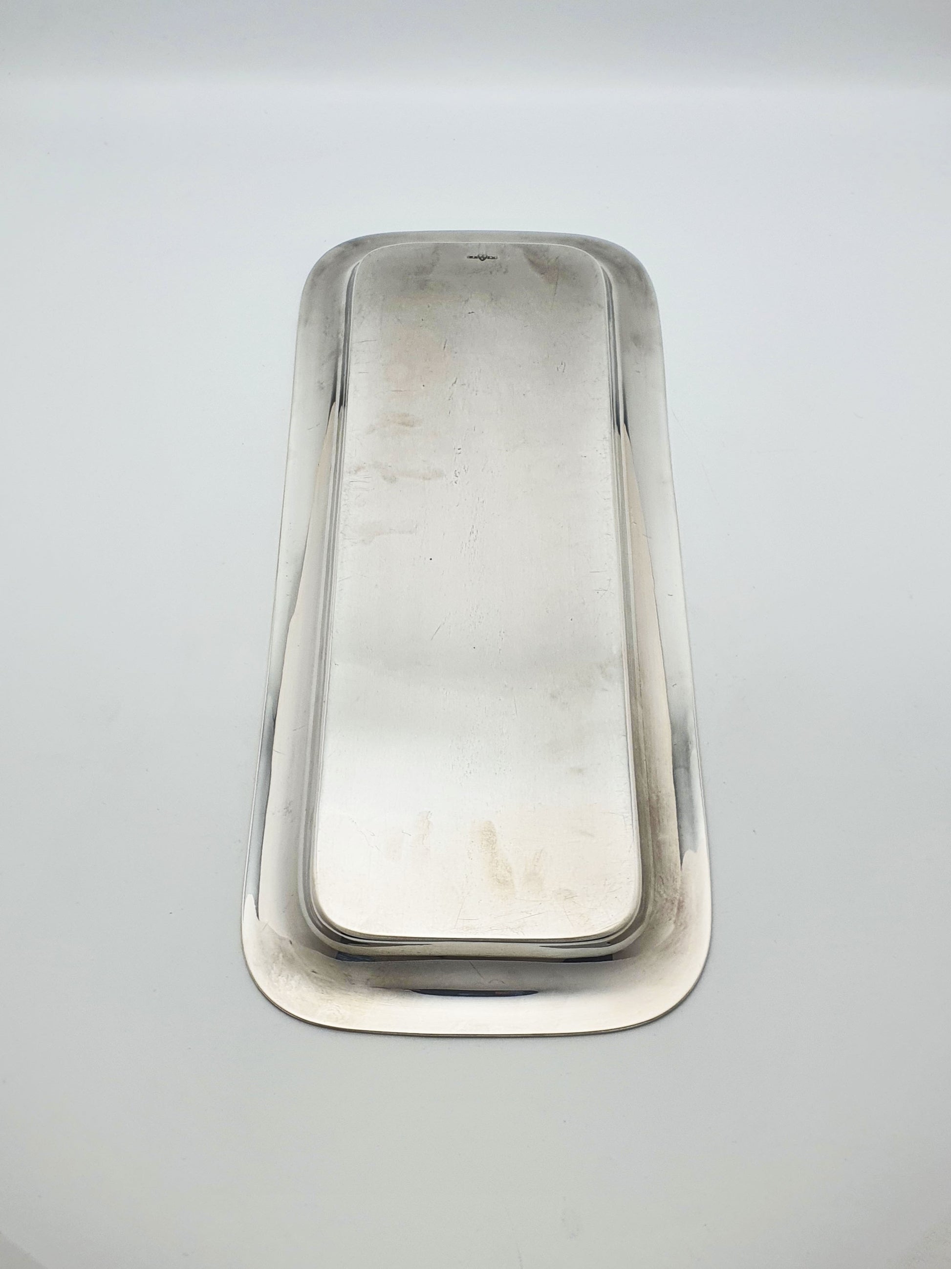 An Elegant Antique Silver-Plated Rectangular Serving Tray with gently rounded corners and soft, flared edges, giving the tray a smooth, balanced appearance. Its long, shallow form makes it ideal for serving drinks or canapés, or for laying out cutlery, condiments, or napkins at a dinner party – circa 1920.